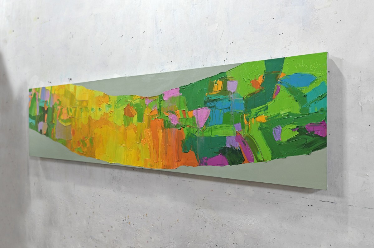 The thick knife textures create a tactile surface, adding depth and rhythm to the piece. Its panoramic size and dynamic color transitions make it a striking statement artwork, ideal for expansive interiors. Shipped rolled for convenience.