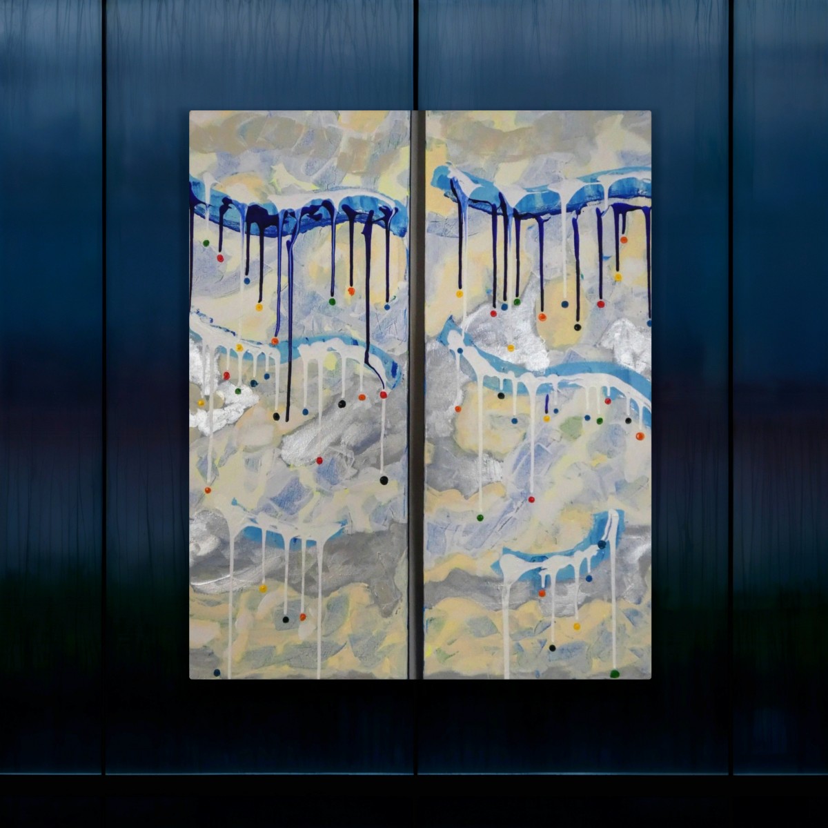 Diptyque “Ciel d’orage, pluie et gouttes d’eau” ©alainhalter 2024. Deux châssis entoilés 100% coton environ 380 g/m2 Gerstaecker Studio XL (3D), Acryliques extra fines Rembrandt et Amsterdam Talens, pouring, emploi de couleurs fluorescentes. Année : août 2024. Format (x2) : 40 (largeur) x 100 (hauteur) x 4,5 (épaisseur) cm. Tranches peintes. Hors encadrement. Pièces uniques. Les couleurs de la photo sont légèrement amoindries par rapport à l'original en raison de l'utilisation de peintures métalliques (argent).