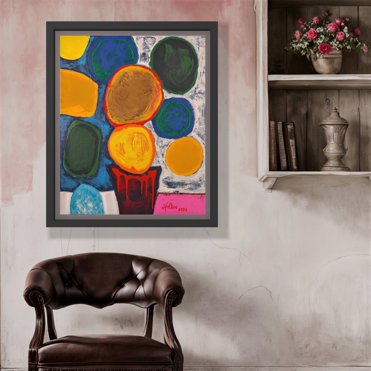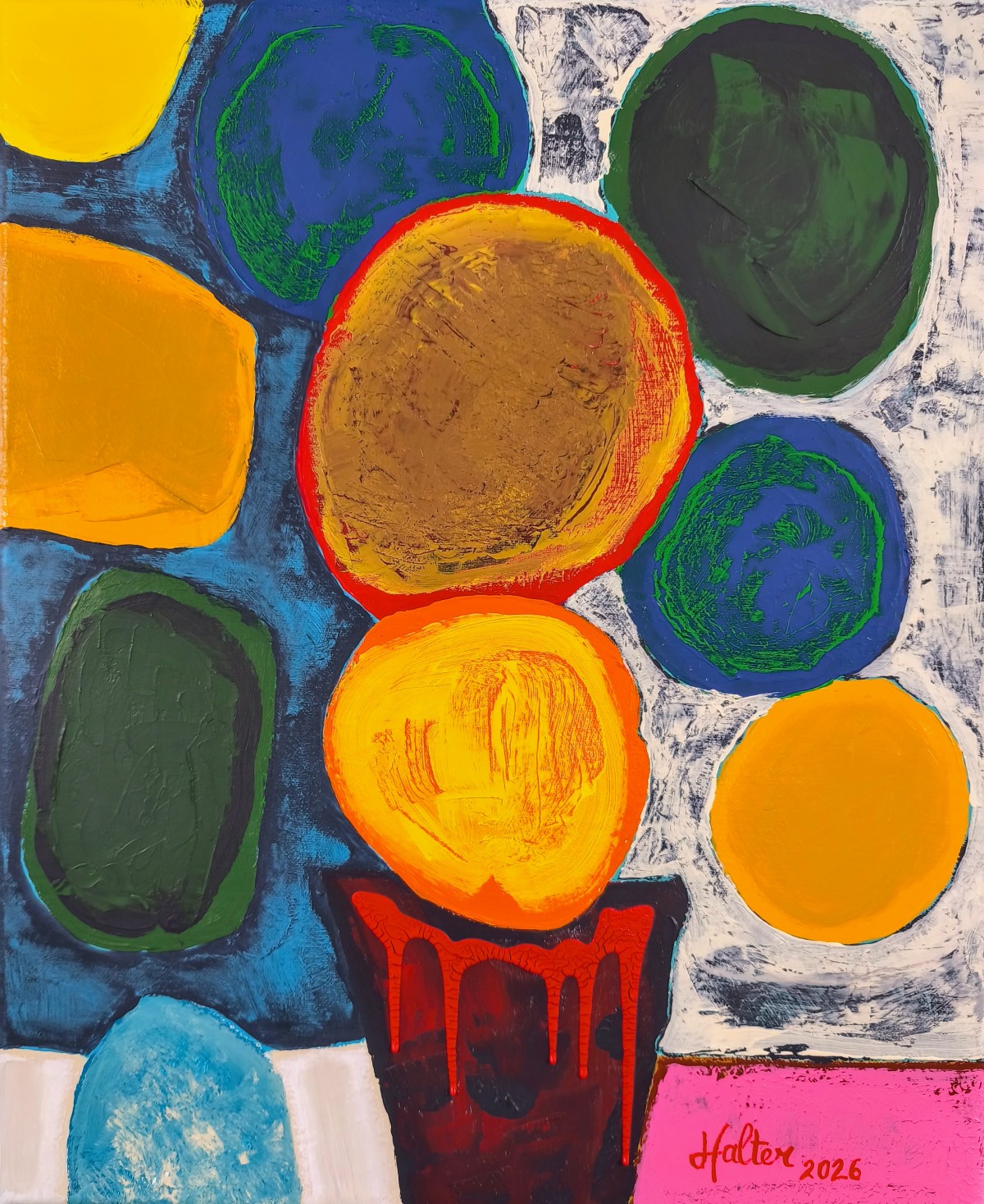 "Feuilles et pot à la glaçure rouge" ©alainhalter 2026. Peintures acryliques Rembrandt et Amsterdam de Royal Talens, pouring expériences Pébéo acryliques sur toile montée sur châssis Gerstaecker Classico. Tranches peintes. Année : janvier 2026. Format (F8) : 38 (largeur) x 46 (hauteur) cm. Hors encadrement. Pièce unique.
