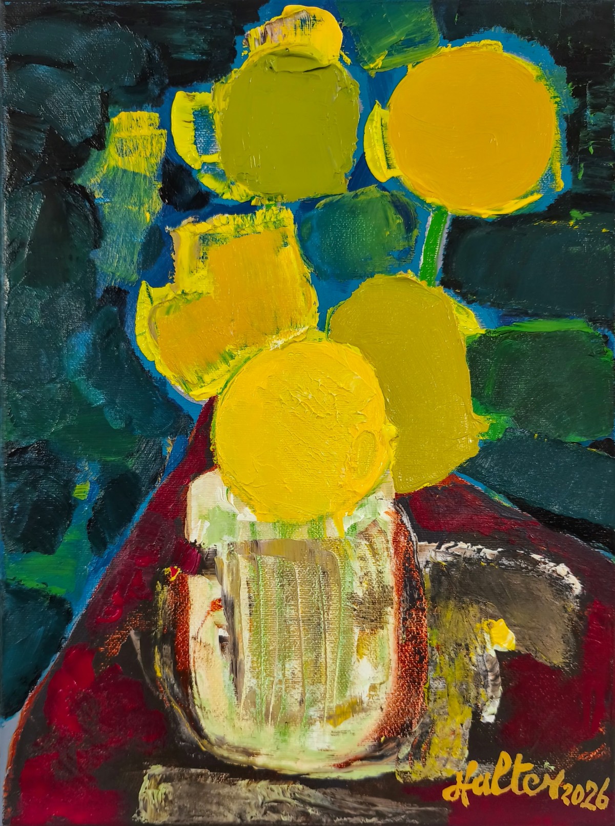 "Pissenlit pour la couleur" ©alainhalter 2026. Peintures acryliques Rembrandt et Amsterdam de Royal Talens sur toile coton montée sur châssis Gerstaecker. Tranches peintes. Année : 20 mars 2026. Format : 30 (largeur) x 40 (hauteur) cm. Hors encadrement. Pièce unique.