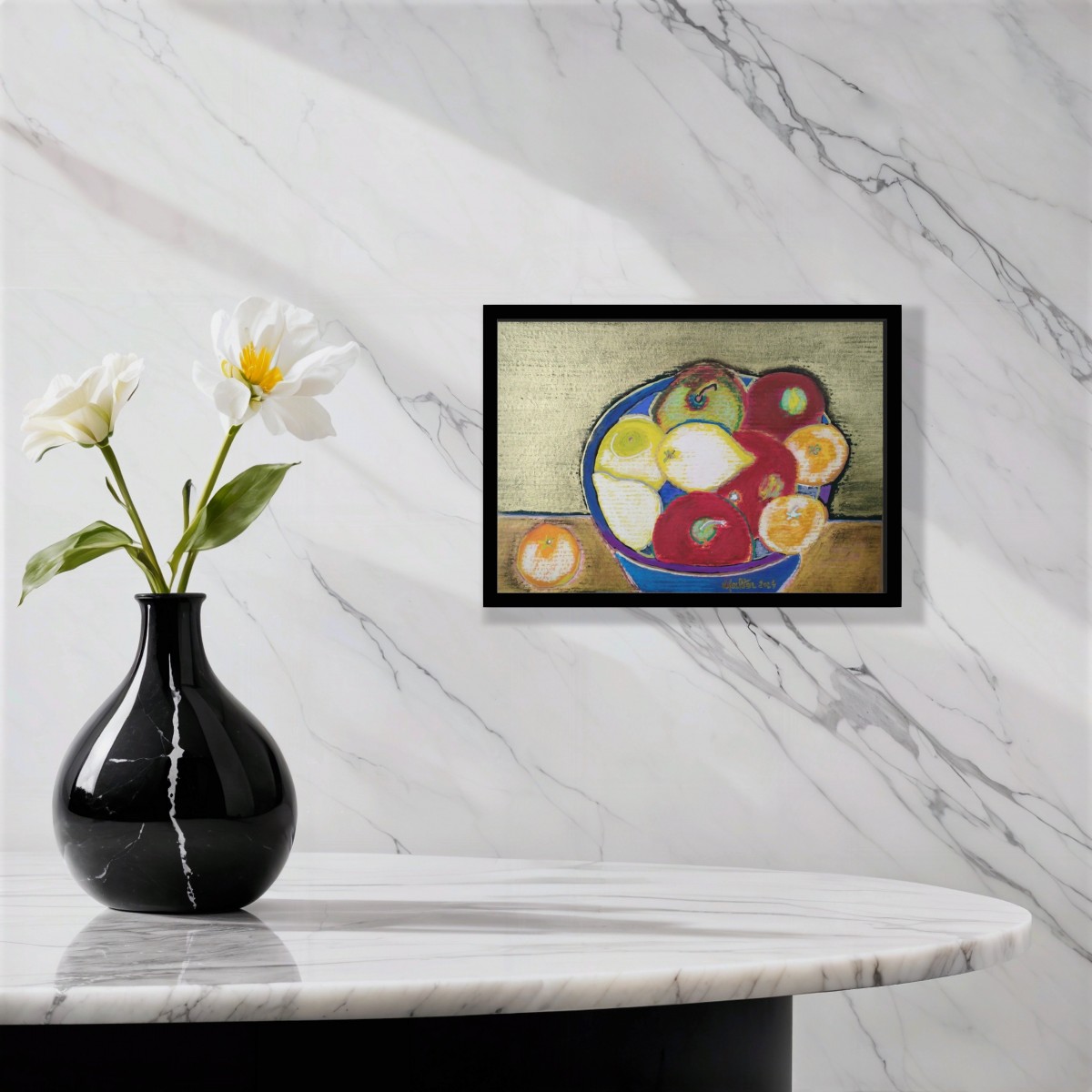 “Sortie de compotier” ©alainhalter 2024. Marqueurs, peinture acryliques et pastels à l'huile sur carton. Année : Aubervilliers, avril-septembre 2024. Format A3 : 42 (largeur) x 29,7 (hauteur) cm. Cadre en pin naturel Umbria black, 32,8 x 45 cm. Pièce unique. Les couleurs de la photo sont légèrement amoindries par rapport à l'original en raison de l'utilisation de peintures métalliques (or).
