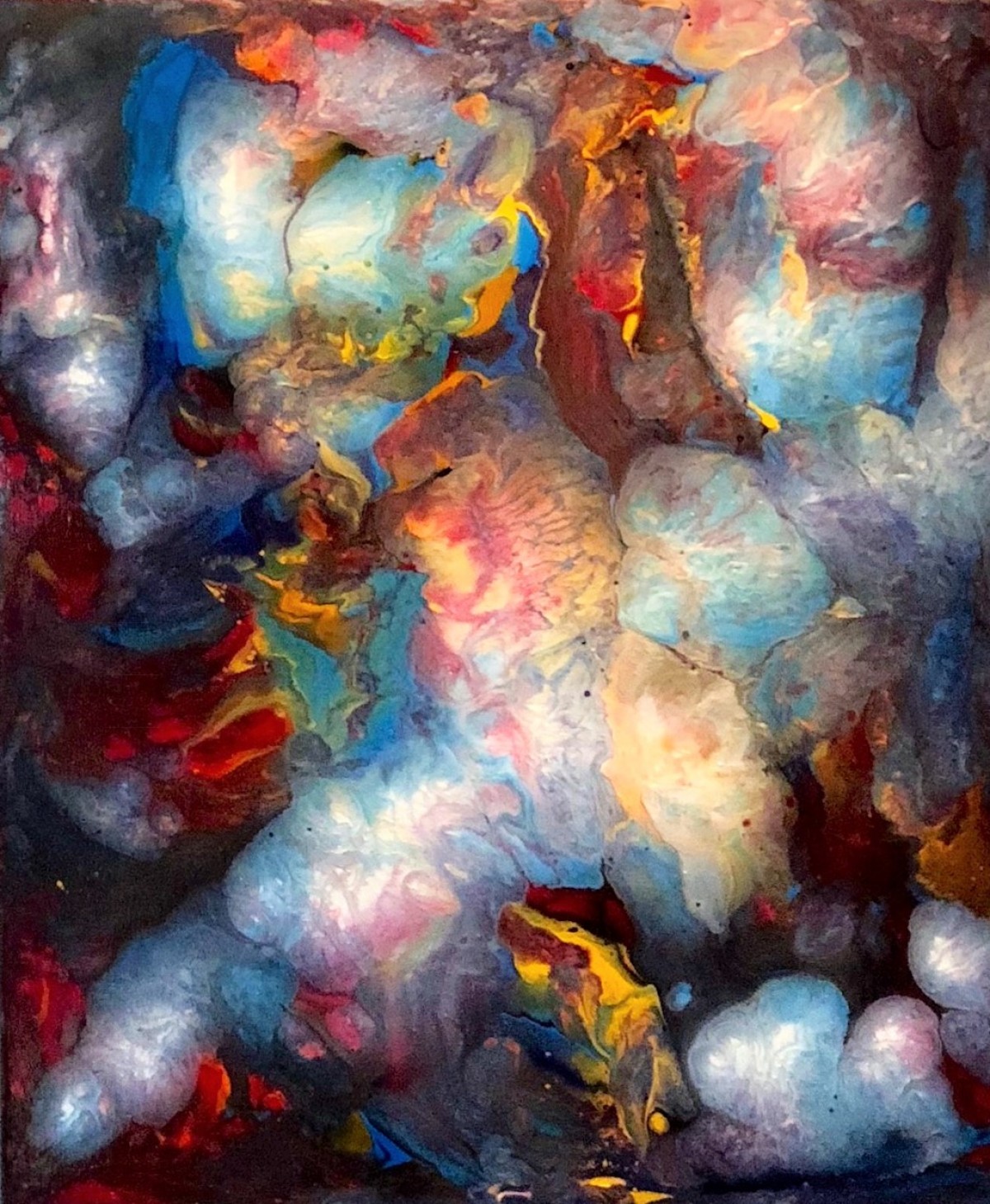 This abstract painting was created using fluid acrylic on a wood panel of 22" x 30" x 1.5".