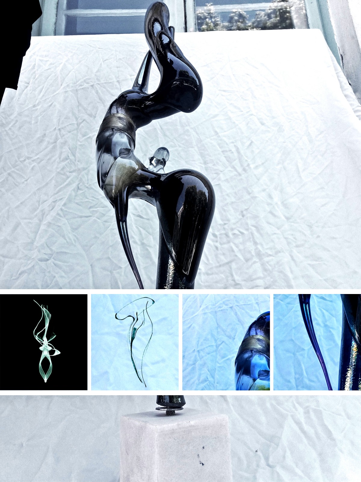 this is a sculpture in glass blowing,i used transparent glass like material,and then for different effects i used metalized black colour.