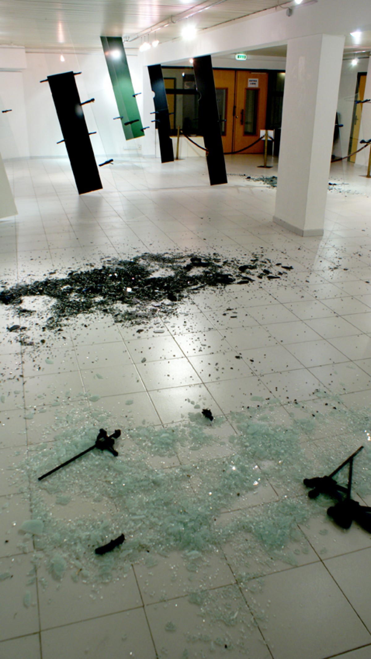 L’espace qui est ici « visé » se constitue certes par la déambulation, mais surtout par la tension palpable qui émane de chaque ensemble de plaques de verre. En effet, ces plaques vont par deux. L’une part du sol et l’autre descend du plafond. L’une incarne une force ascendante, l’autre une force descendante. C’est parce que toutes deux se rejoignent quelque part « dans » l’espace que ces forces deviennent à la fois réelles et visibles. C’est cette rencontre qui transforme et module l’espace d’une manière qui, sans elle, n’existerait pas.