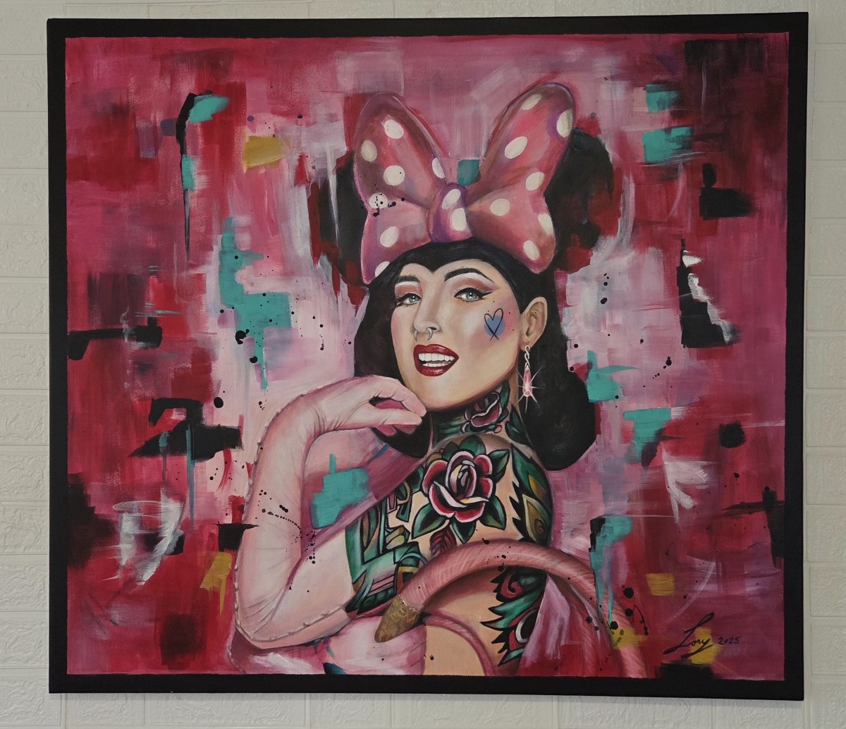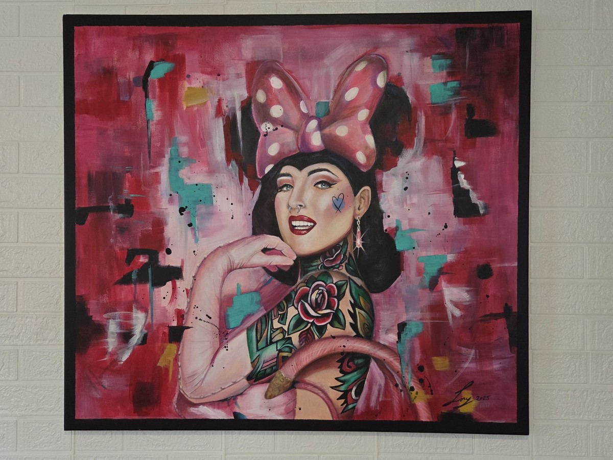 L’imagerie populaire contemporaine s’inscrit au cœur de cette œuvre. Les codes du tatouage, de la culture pop et du réalisme s’y rencontrent dans une composition expressive et contrastée. Le portrait, frontal et assumé, affirme une présence forte où l’identité devient symbole et prise de position.