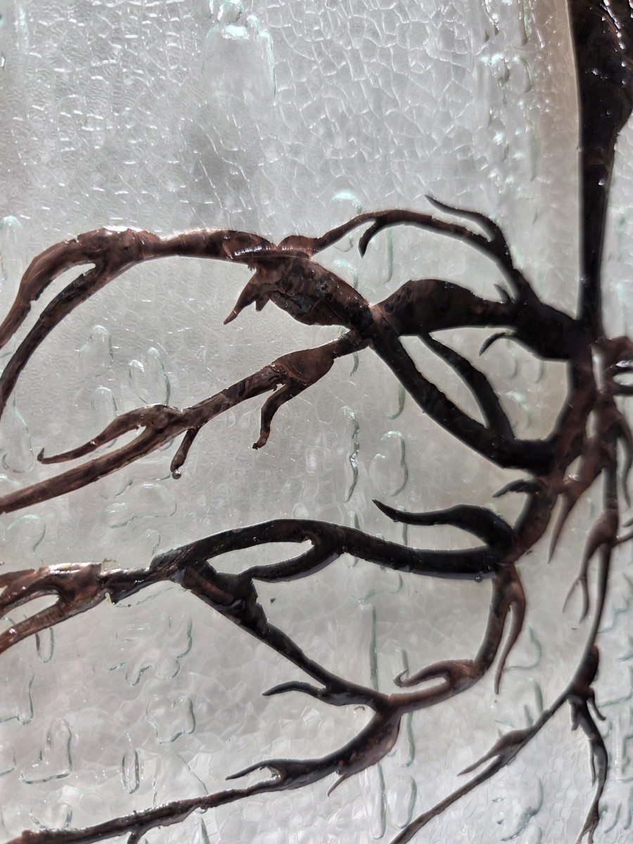Deux corps entrelacés s'élèvent comme des arbres: leurs bras deviennent branches, leurs pieds s'enfoncent en racines.