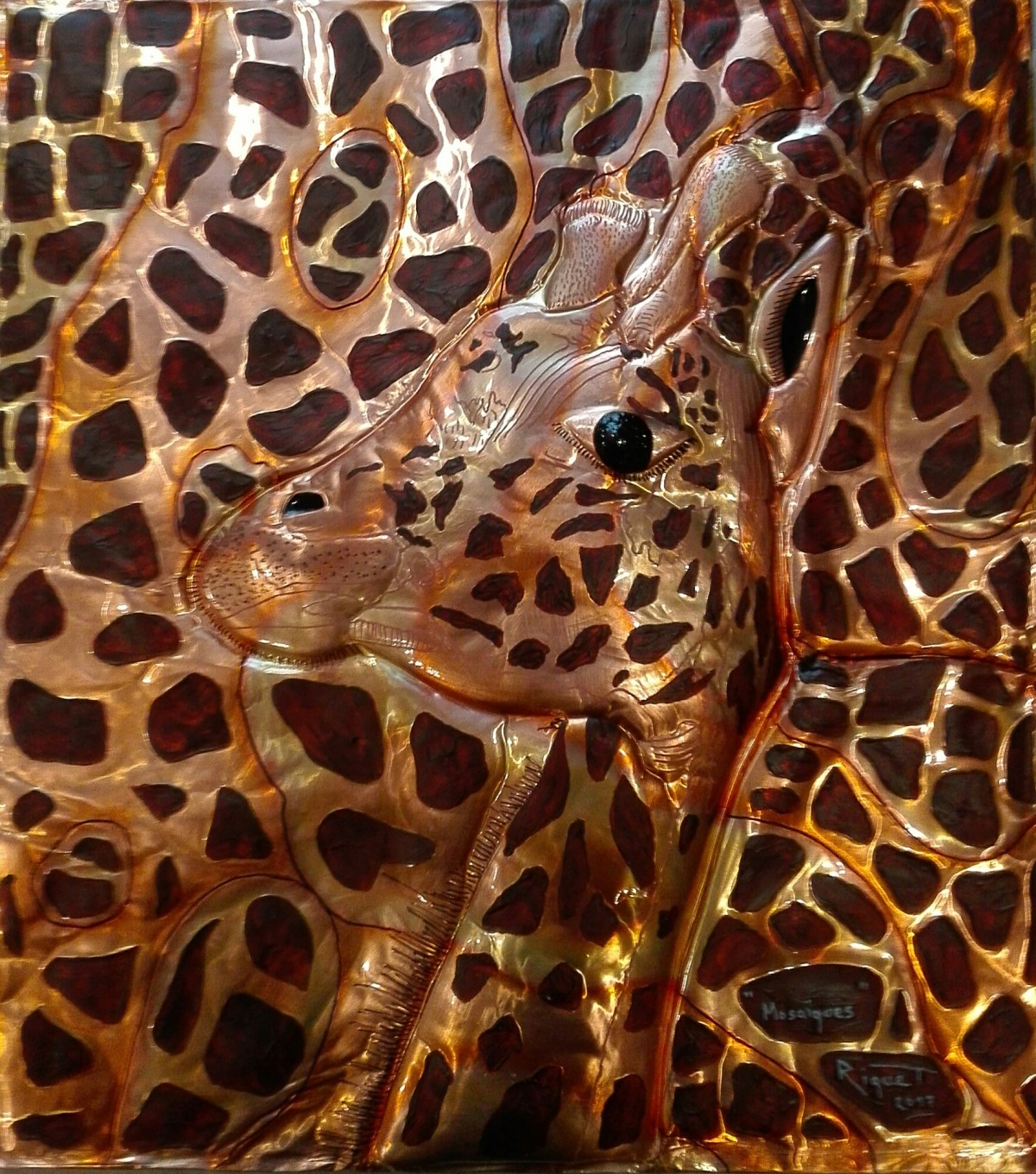 Feuille de cuivre repoussé, résiné et collé sur support bois . Peintures laques et acryliques . Posca . Patines et vernis .