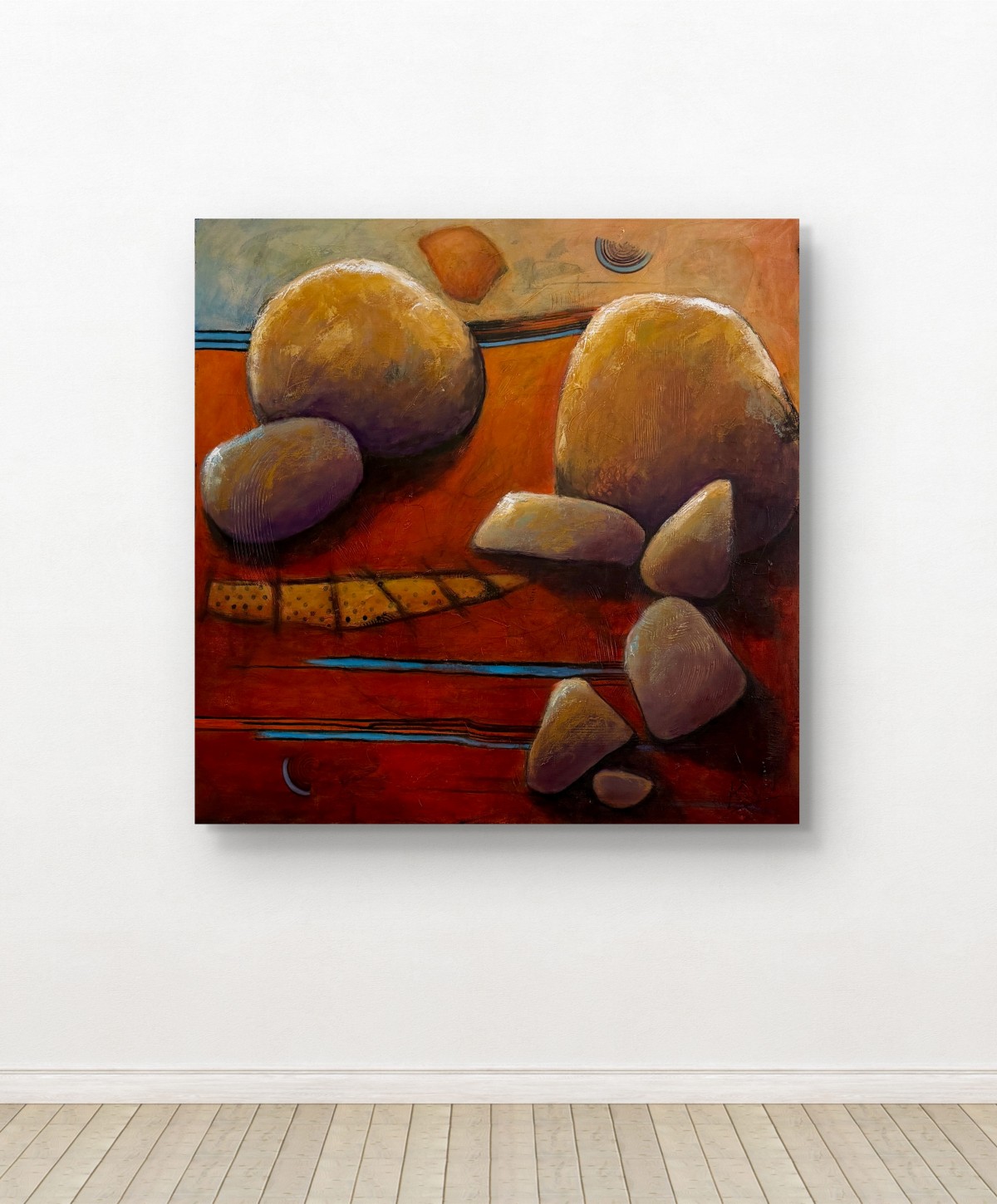 Des formes minérales, inspirées de la pierre, se déposent dans un paysage chaleureux aux teintes ocre.