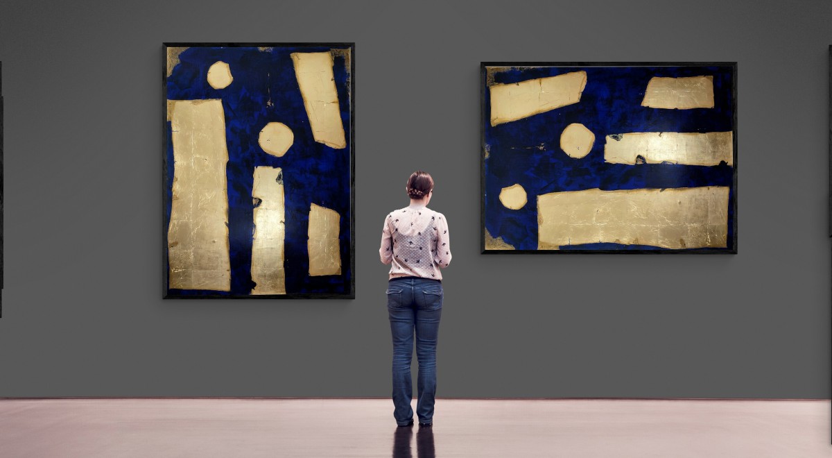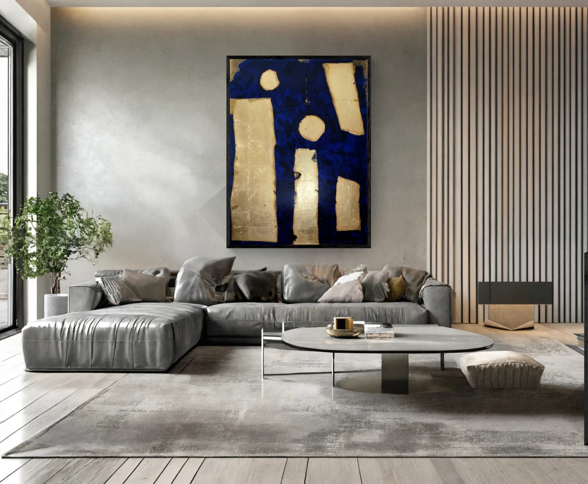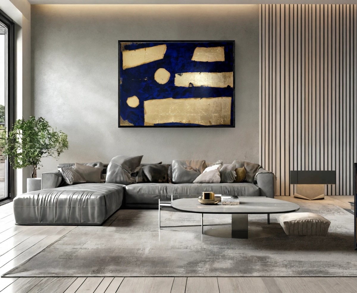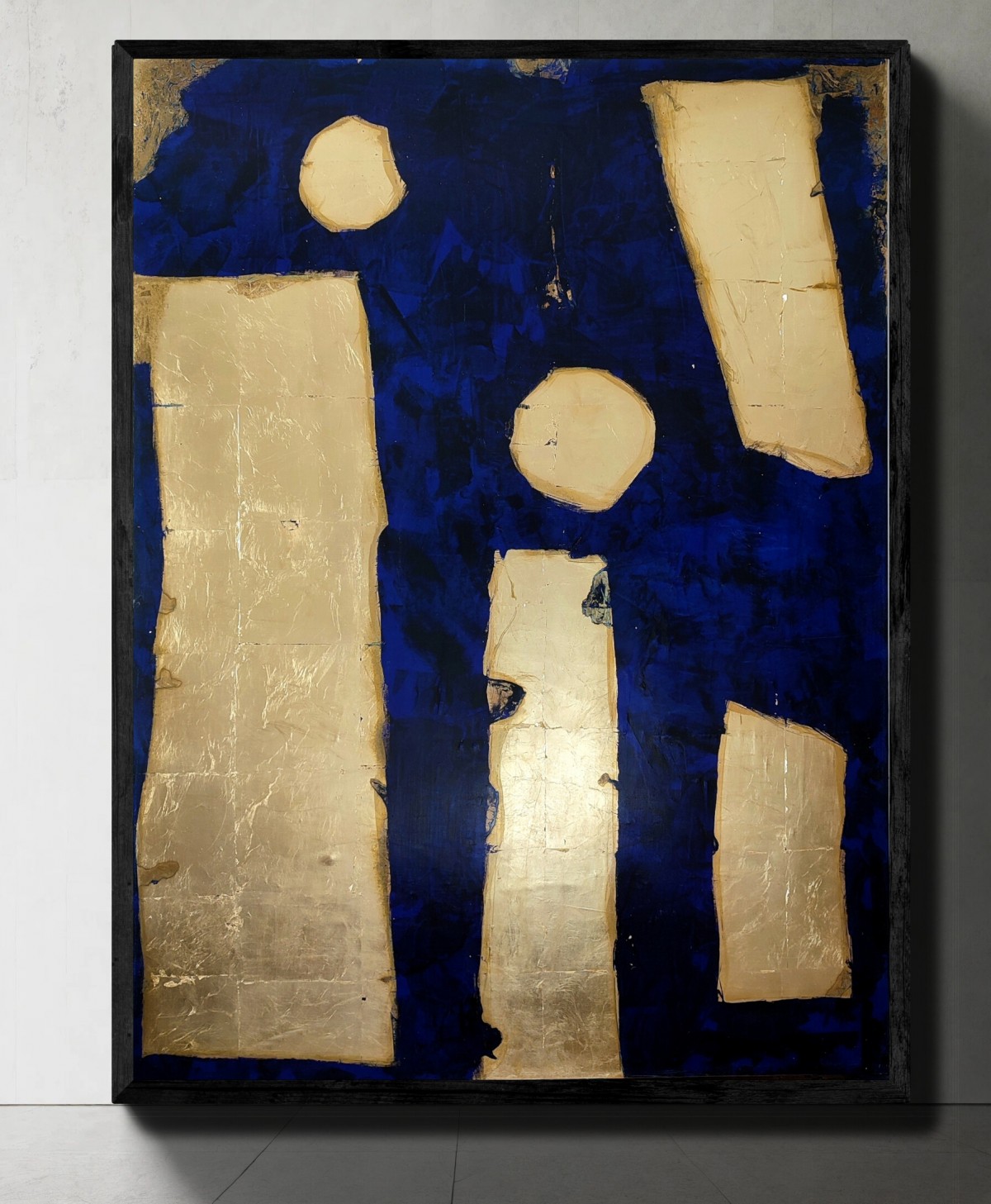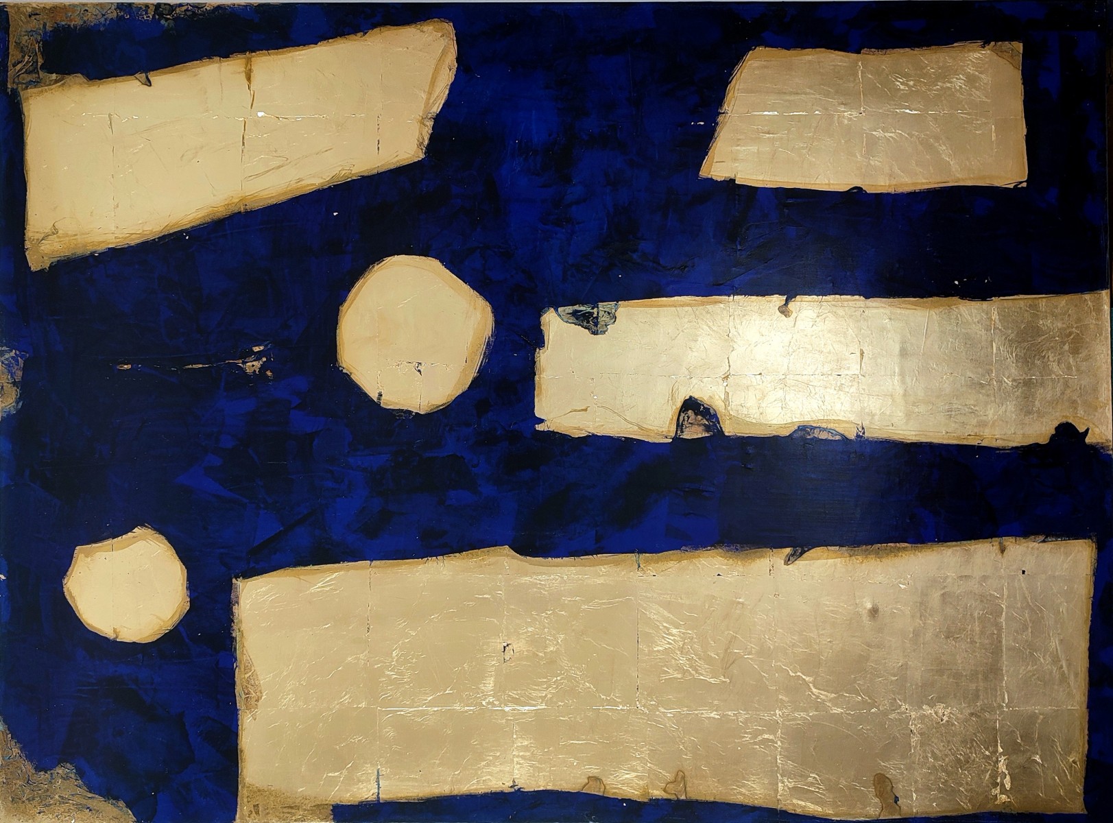 Le mariage du soleil et de la nuit, du classicisme à la Française et de l’abstraction lyrique très moderne . Feuille d'or et peinture sur toile 130/100 cm environ.