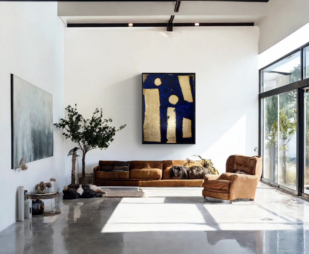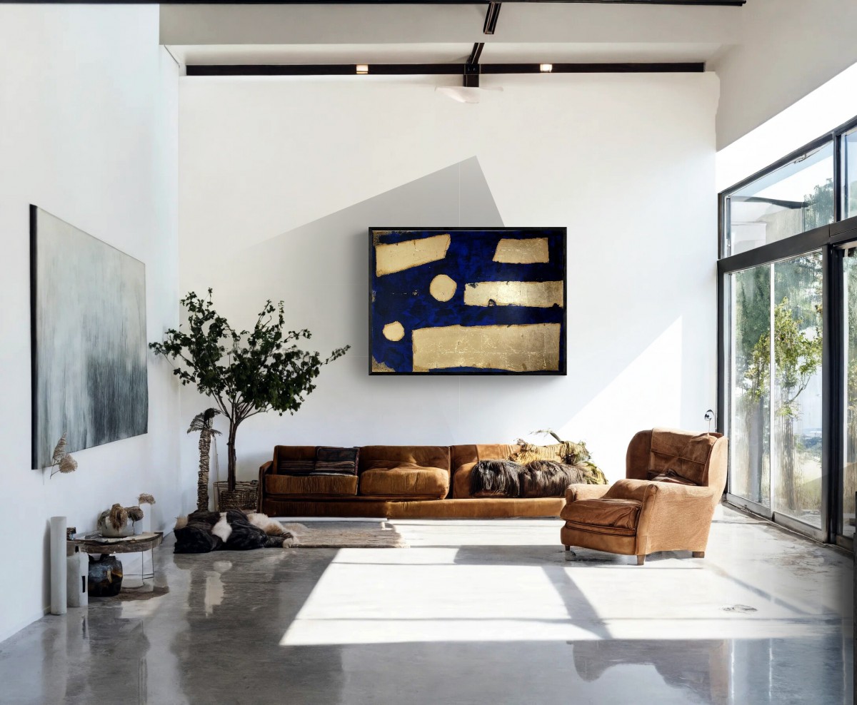 Les photos en situation sont des suggestions, elles ne sont pas obligatoirement à l’échelle, le tableau est signé au dos pour ne pas lui donner un sens d’accrochage imposé, le sens est libre et peut être changé.