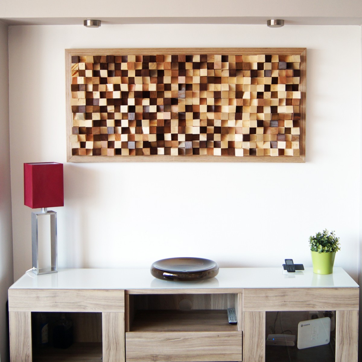 This hanging wall art has sound absorbing properties. It is called a sound diffuser. It improves sound diffusion in a space.