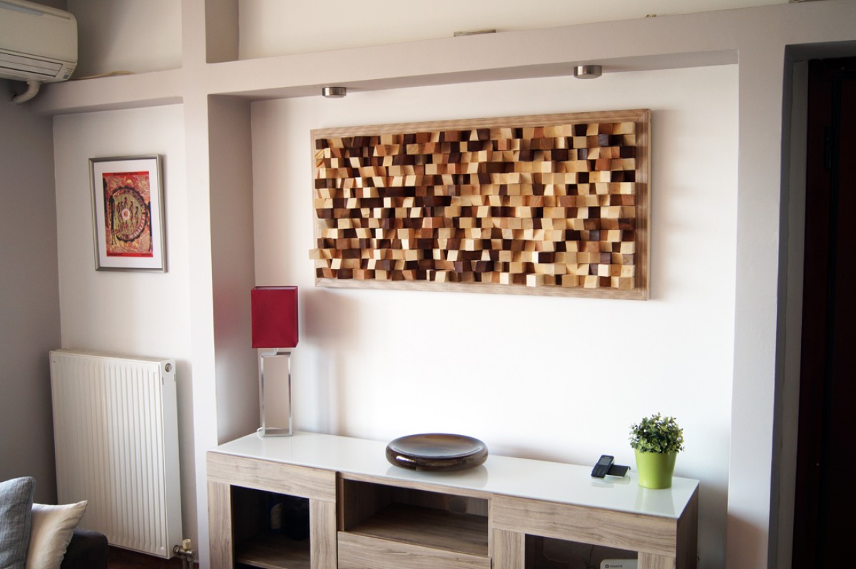 This product is an original handmade product created in Greece. It is made of various type of woods. It forms an abstract wall art mosaic made of reclaimed wood blocks. Each piece is handmade cut and painted on hand.
