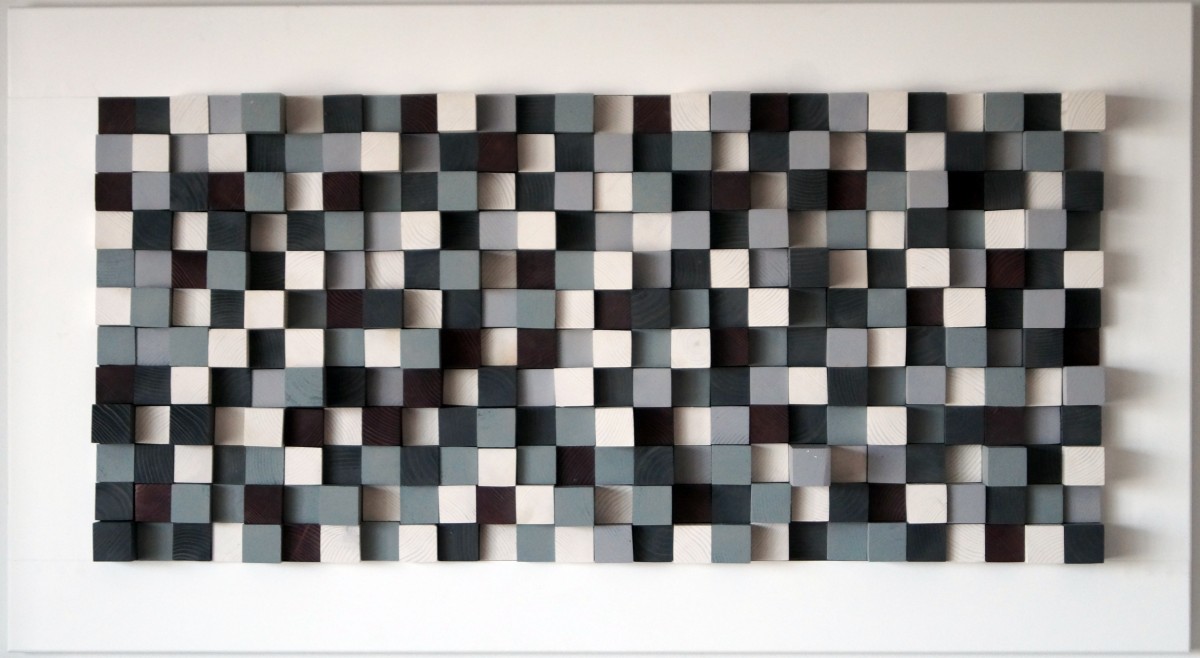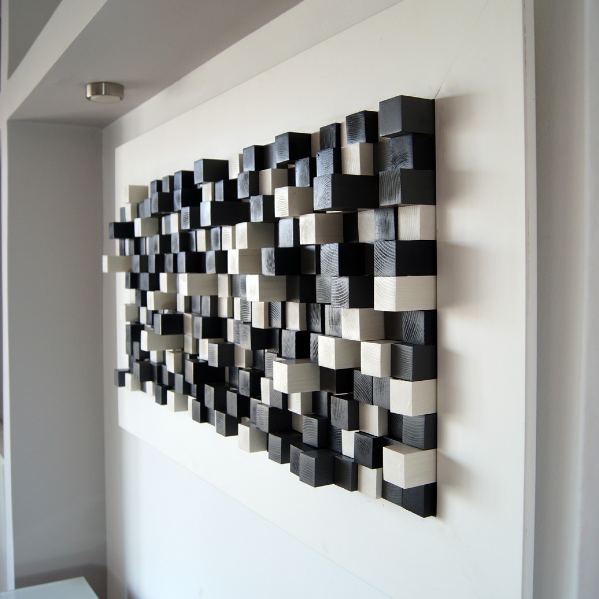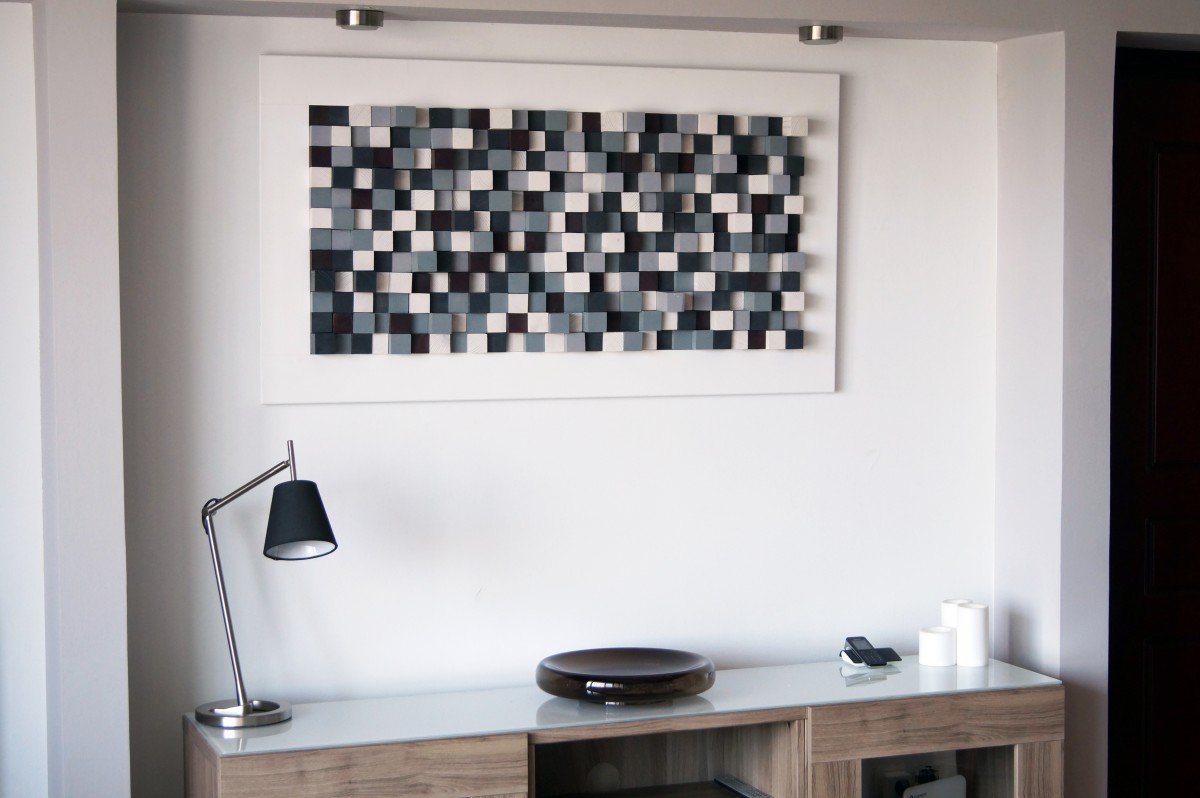 It forms an abstract wall art mosaic made of reclaimed wood blocks. Each piece is handmade cut and painted on hand. This hanging wall art has sound absorbing properties. It is called a sound diffuser. It improves sound diffusion in a space.