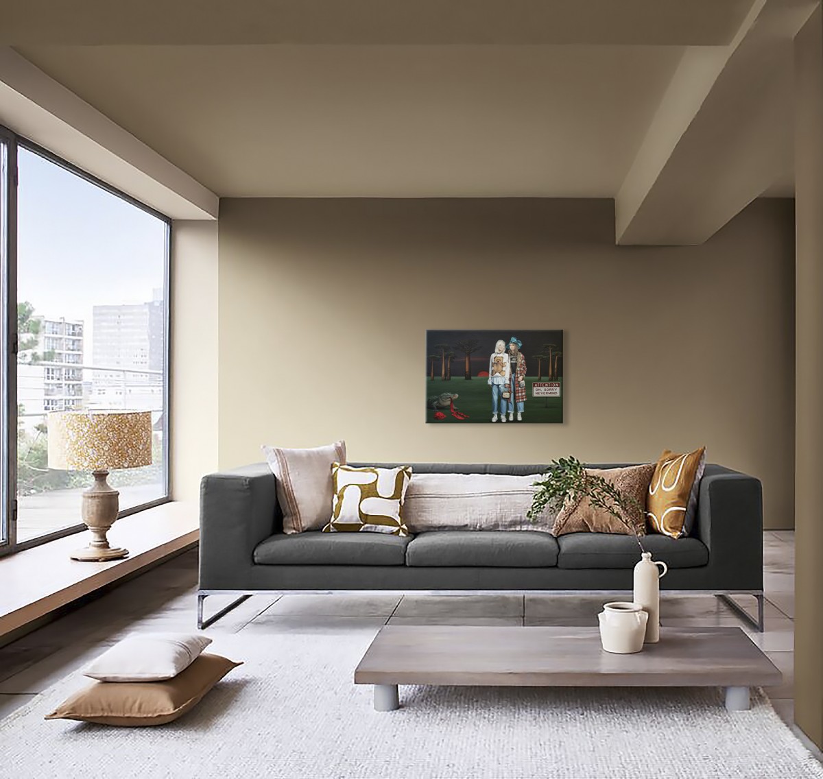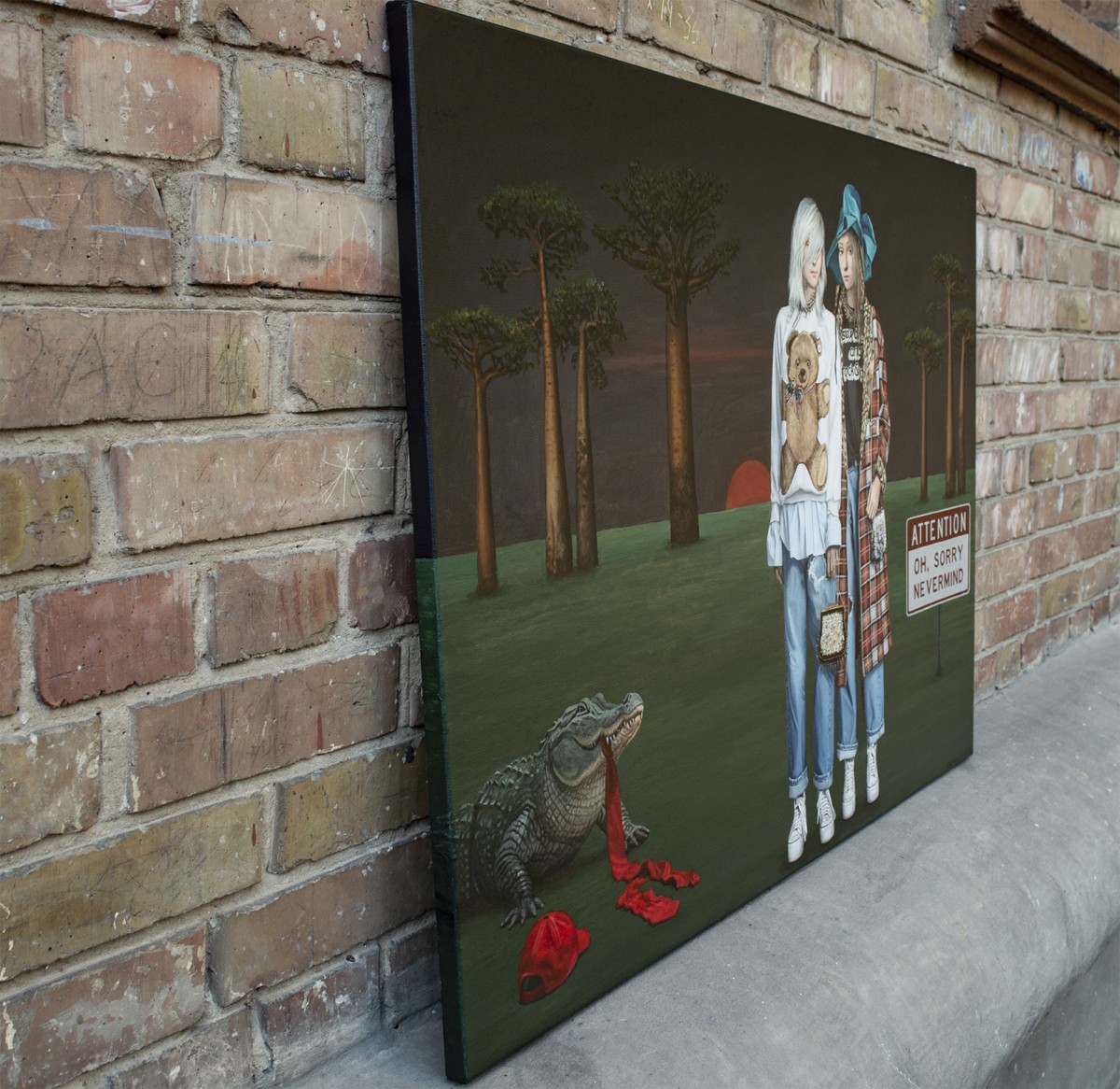 This painting bridges irony, tenderness, and rebellion. It invites collectors to feel the tension between innocence and danger, humor and unease, pop culture and quiet protest. Every symbol holds a whisper — the crocodile alluding to institutional captivity, the red fabric to rhetoric and ego. A singular work of both beauty and commentary, it resonates far beyond the frame.