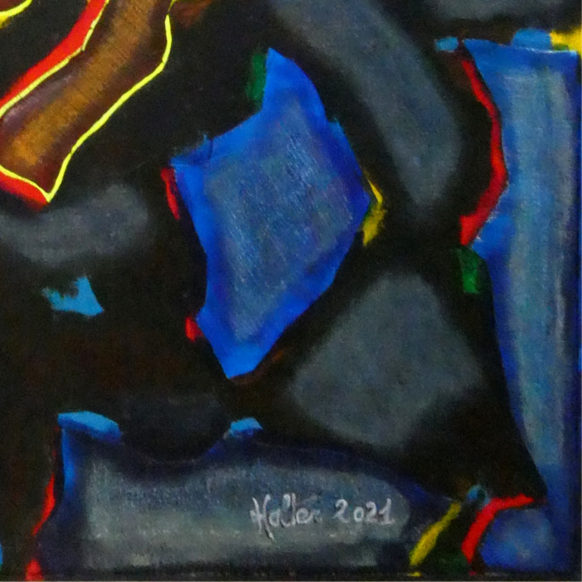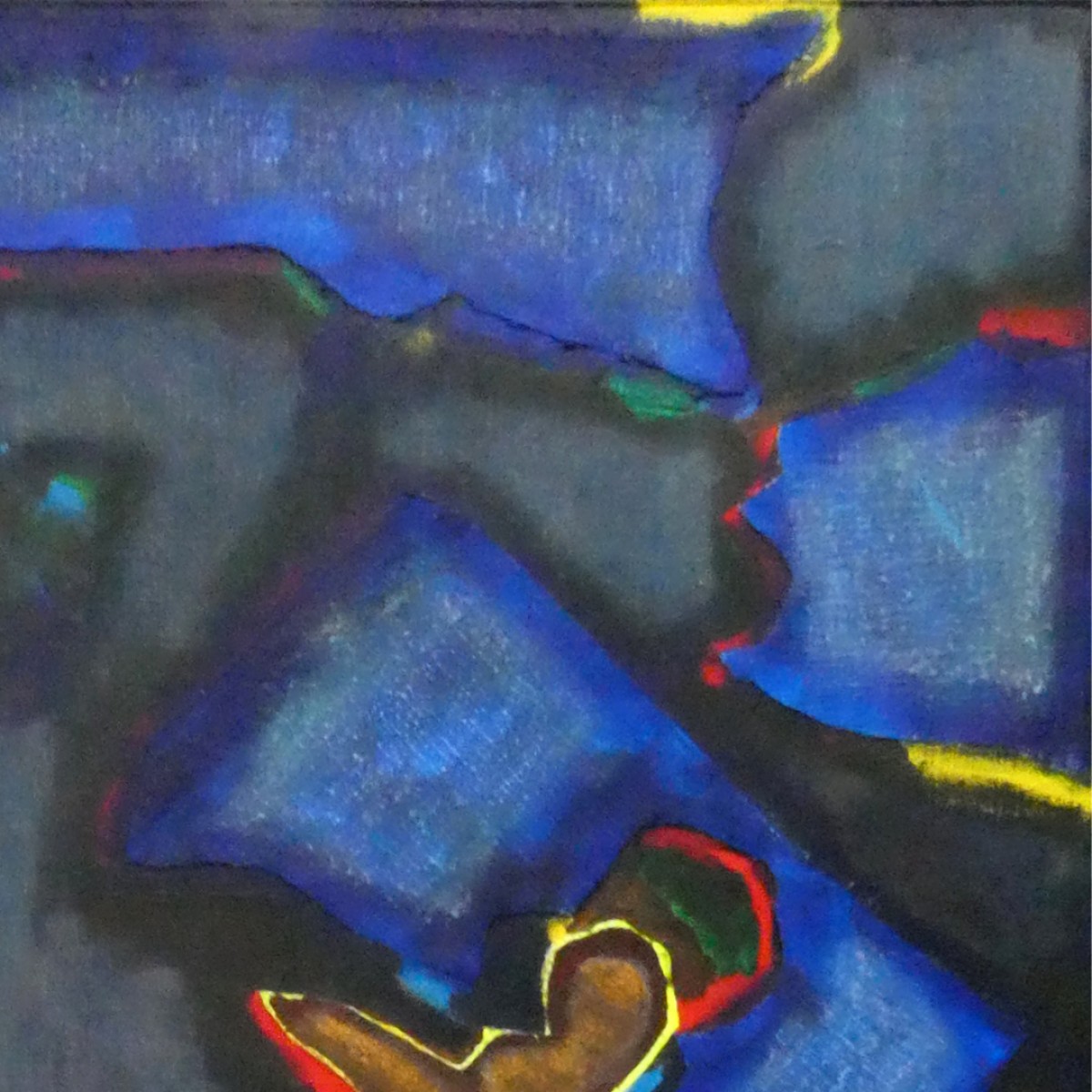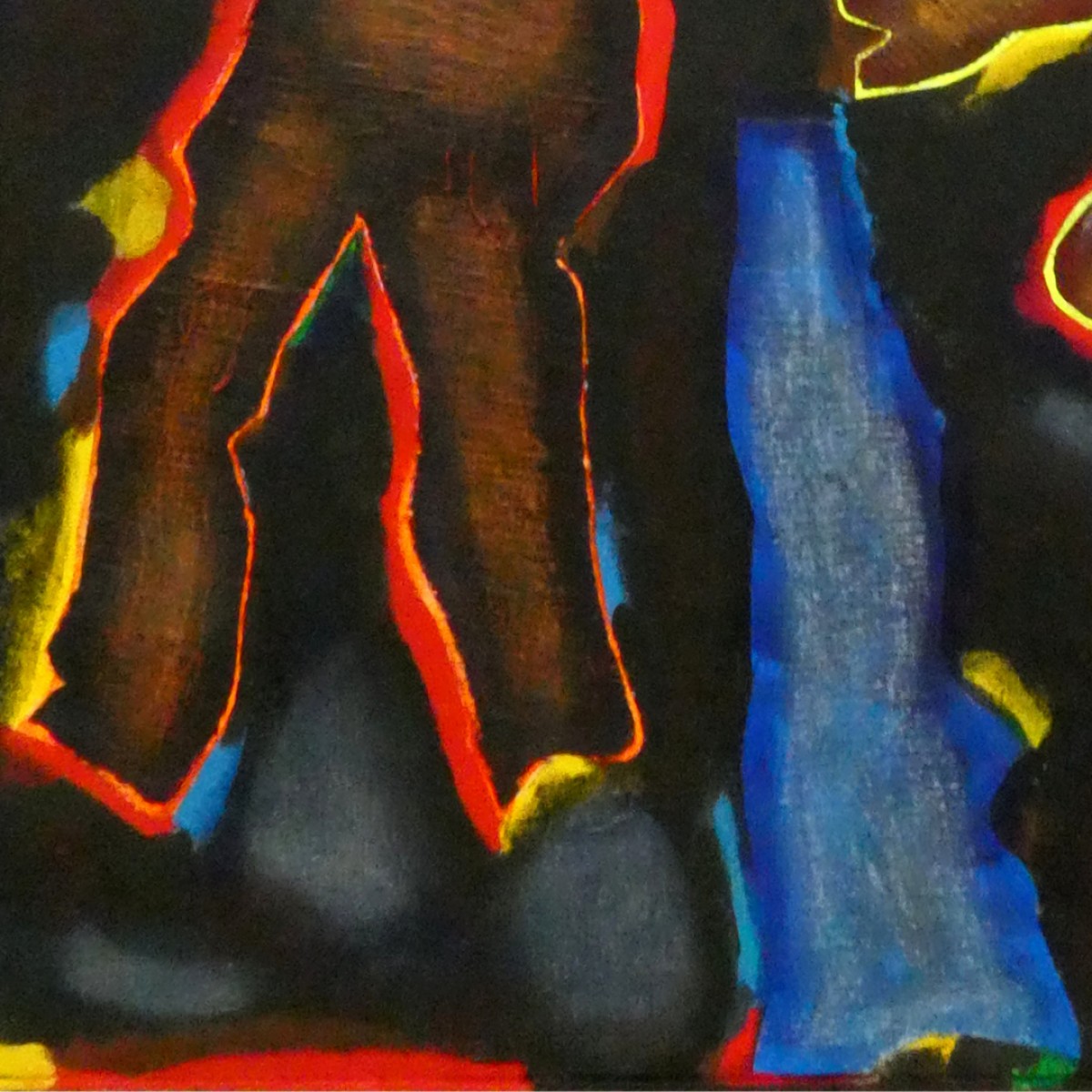 "Bonhommes nocturnes" ©alainhalter 2021. Peinture acrylique sur toile et châssis. Découpe et collage de toile sur toile. Usage de crayons Schwan Stabilo tone. Année : Aubervilliers, juillet 2021. Format 20F : 60 (largeur) x 73 (hauteur) cm. Encadrement baguette artiste noir, 61 (largeur) x 74 (hauteur) cm. Pièce unique.