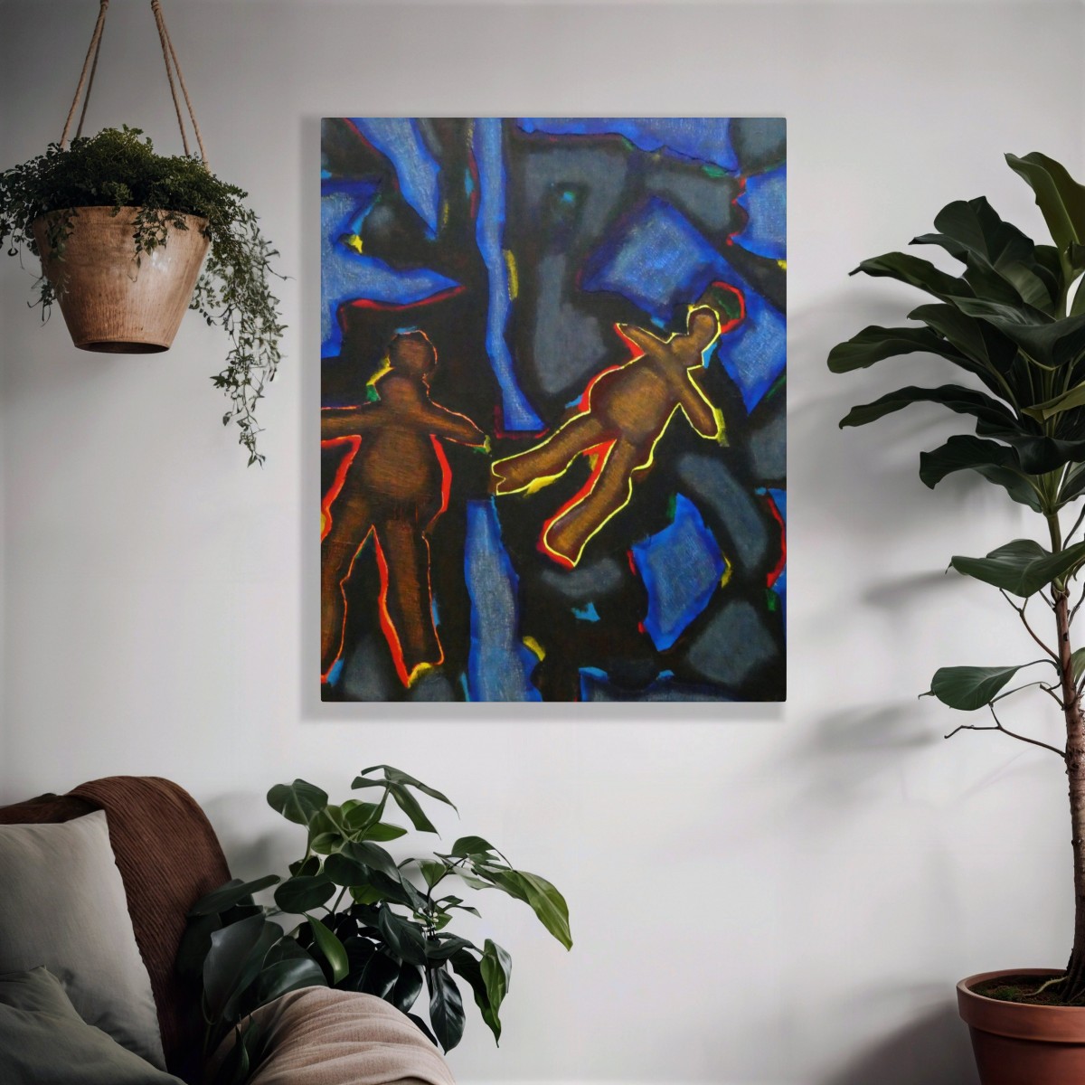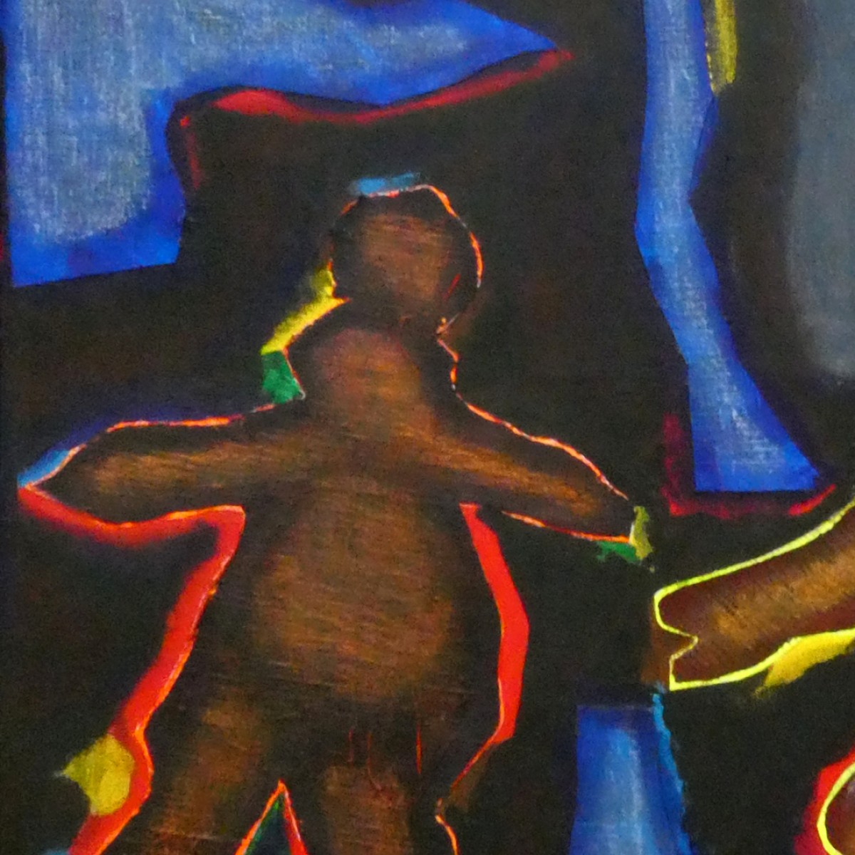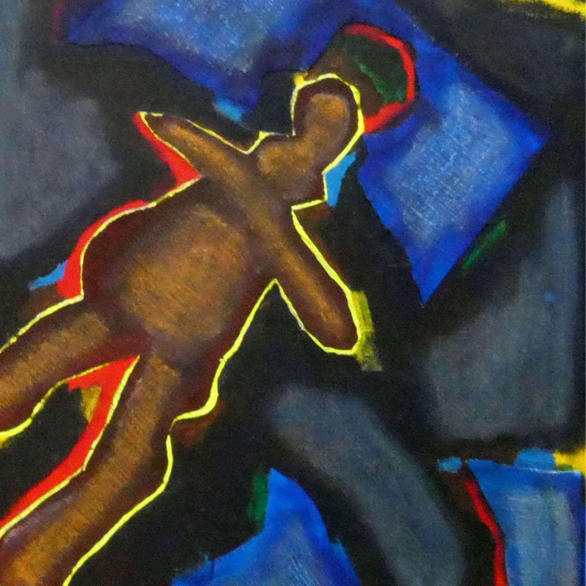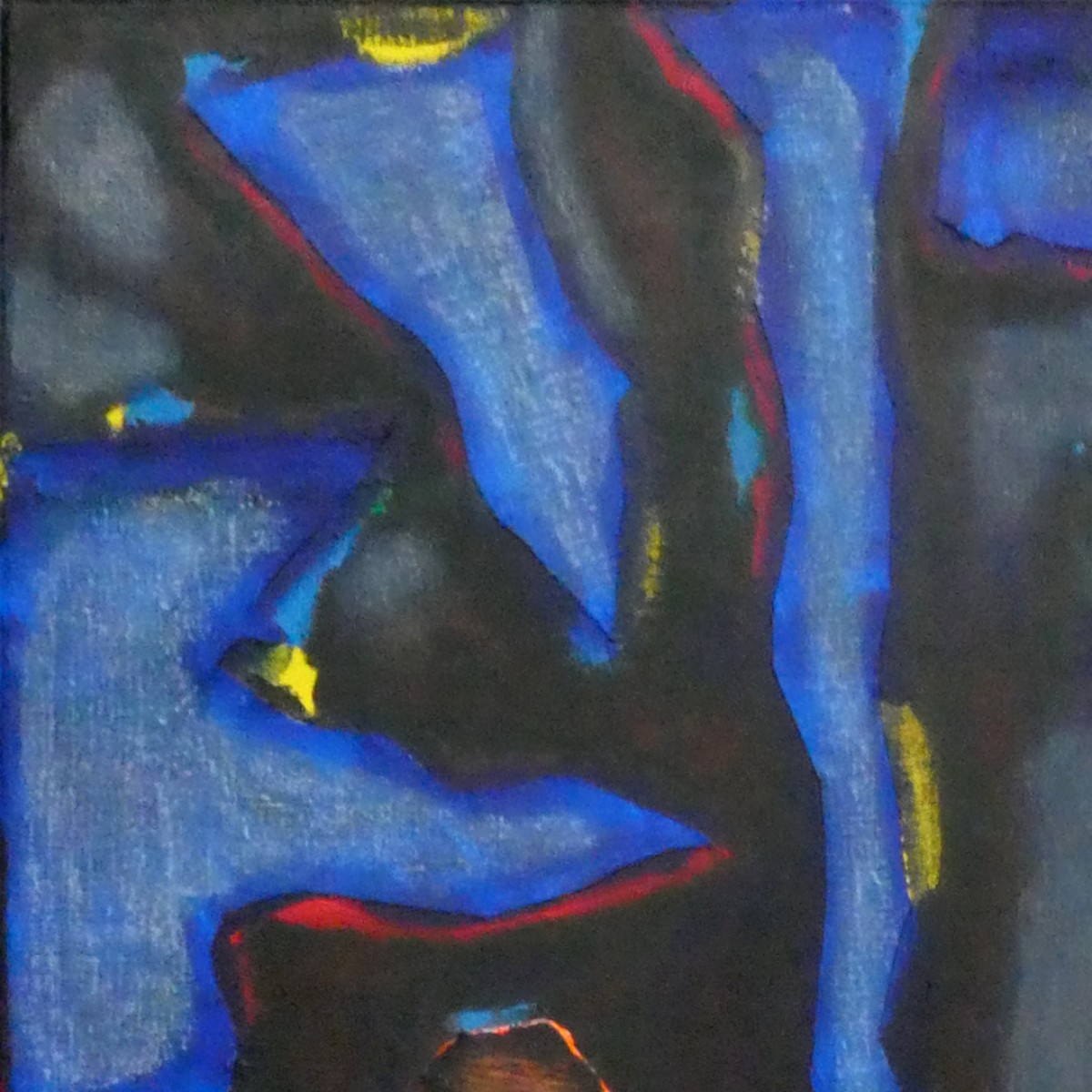 "Bonhommes nocturnes" ©alainhalter 2021. Peinture acrylique sur toile et châssis. Découpe et collage de toile sur toile. Usage de crayons Schwan Stabilo tone. Année : Aubervilliers, juillet 2021. Format 20F : 60 (largeur) x 73 (hauteur) cm. Encadrement baguette artiste noir, 61 (largeur) x 74 (hauteur) cm. Pièce unique.