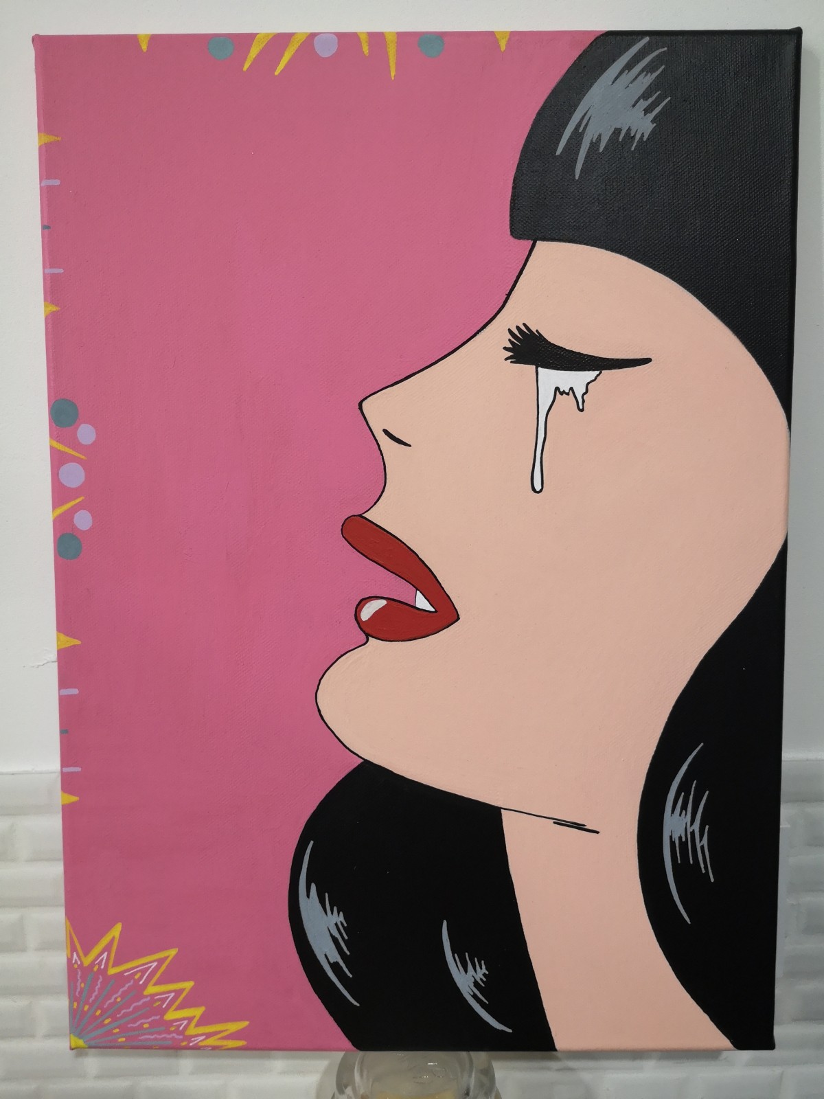 Acrylic paint. A 23-year-old student and employee in a large food store, I started painting two months ago to escape this anxiety-provoking period. I'm not a professional, I'm self-taught and use myself as a role model. I wish to sell my works to finance a 6 months trip on three continents, September 2021, to see for myself the current chance we have to marvel at some landscapes that tomorrow will disappear for climatic reasons. This is my third painting, the first one in pop art style. The difficulty, its title refers to a subjective interpretation which could be, in my opinion, the difficulty of advancing as a woman in this world. The sadness that will give us the strength to move forward, in my case and that of many other students, not to sink into depression in the face of isolation.