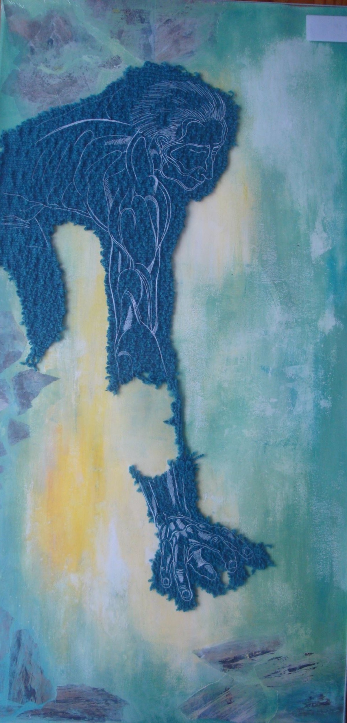 Inspiré par un morceau de pull tricoté et pas fini , l'homme est gravé sur le plexis le fond de papier est peind a l' acrylique .