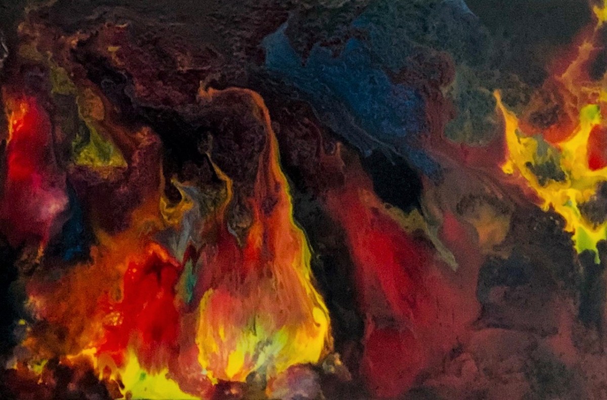 This fluid acrylic painting was created using a variety of mediums to obtain the textured glossy finish on gallery canvas of 24" x 36" x 1.5".