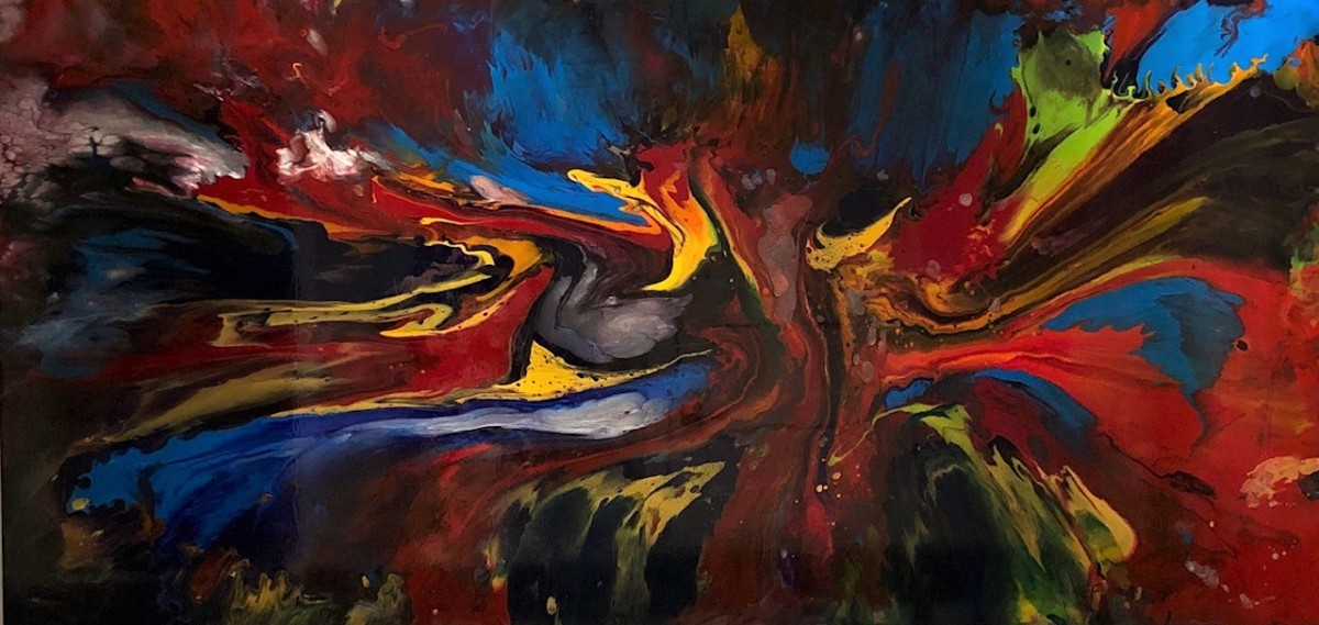 This fluid acrylic painting was created with the use of acrylic paint and mixed media to obtain the necessary flow to create a fluid acrylic with a glossy finish. It was painted on a canvas of 24" x 36" x 1.5".