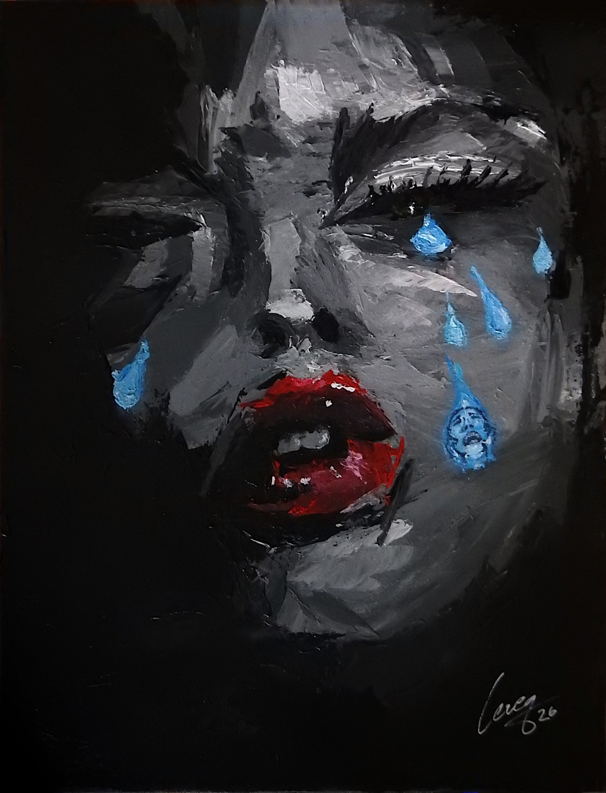 Ce portrait révèle un visage empreint d'une présence émotionnelle à la fois discrète et intense. Réalisée à l'acrylique, la toile utilise principalement des nuances de gris et de noir pour définir les traits, tandis qu'une touche de rouge vif sur les lèvres attire immédiatement le regard. Les lèvres, légèrement entrouvertes, suggèrent une émotion contenue. Les yeux, dissimulés dans l'ombre, sont soulignés par des cils bien dessinés. De ces yeux voilés coulent des larmes d'un bleu éclatant, créant un contraste saisissant qui souligne le poids d'une douleur indicible. Le fond sombre élimine toute distraction, concentrant l'attention sur le jeu expressif des couleurs et des textures. La peinture saisit la persistance d'une souffrance invisible, rendant tangible le fardeau silencieux souvent porté en soi.