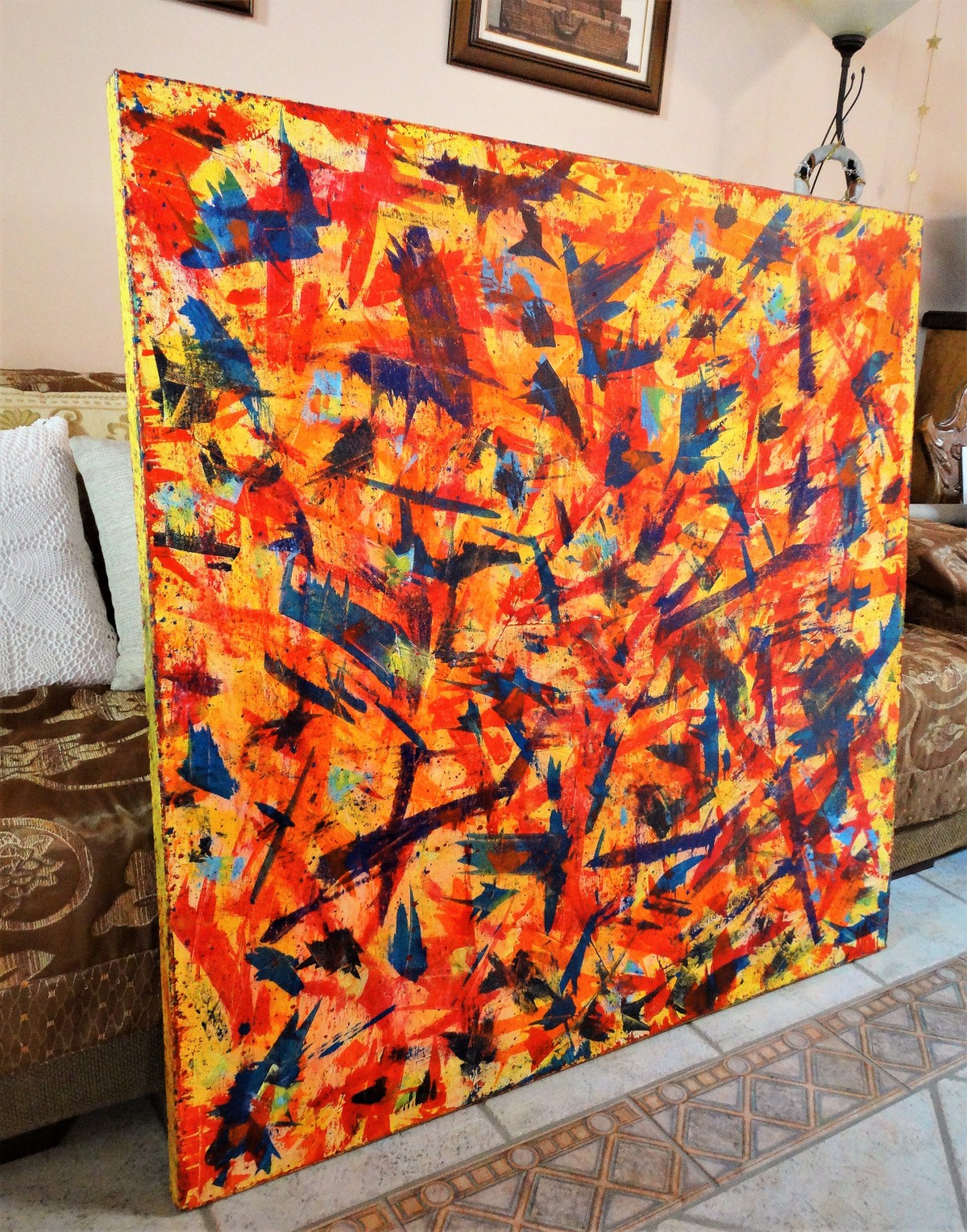 Once carefully unwrapped, there is no need to frame as they're all ready to hang in the place you have chosen. This work is painted on its deep edges