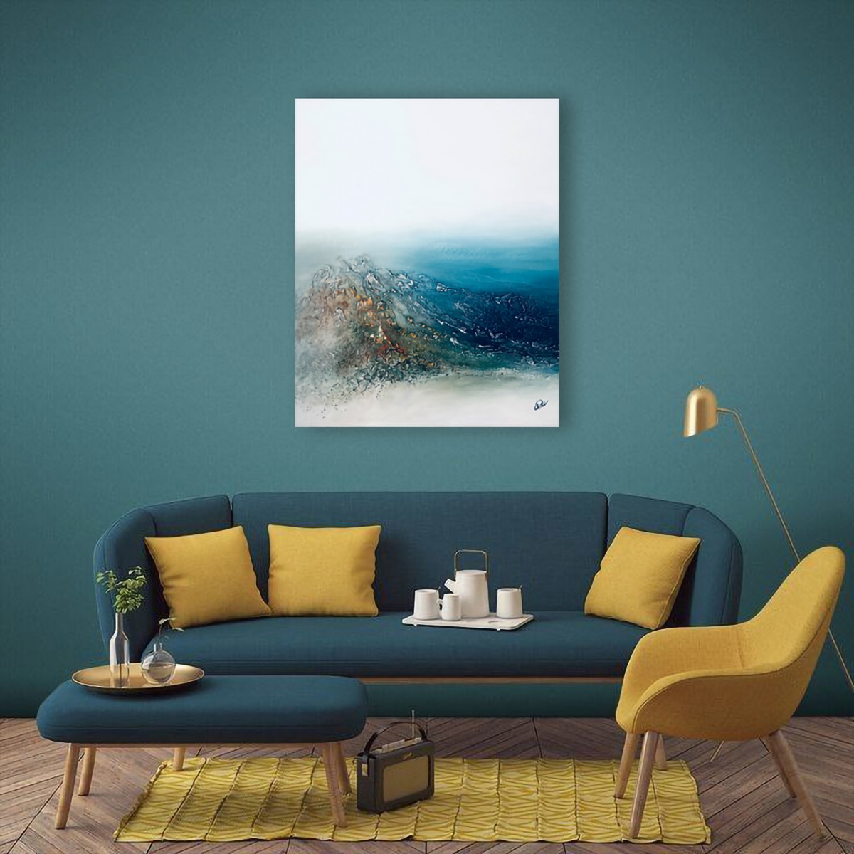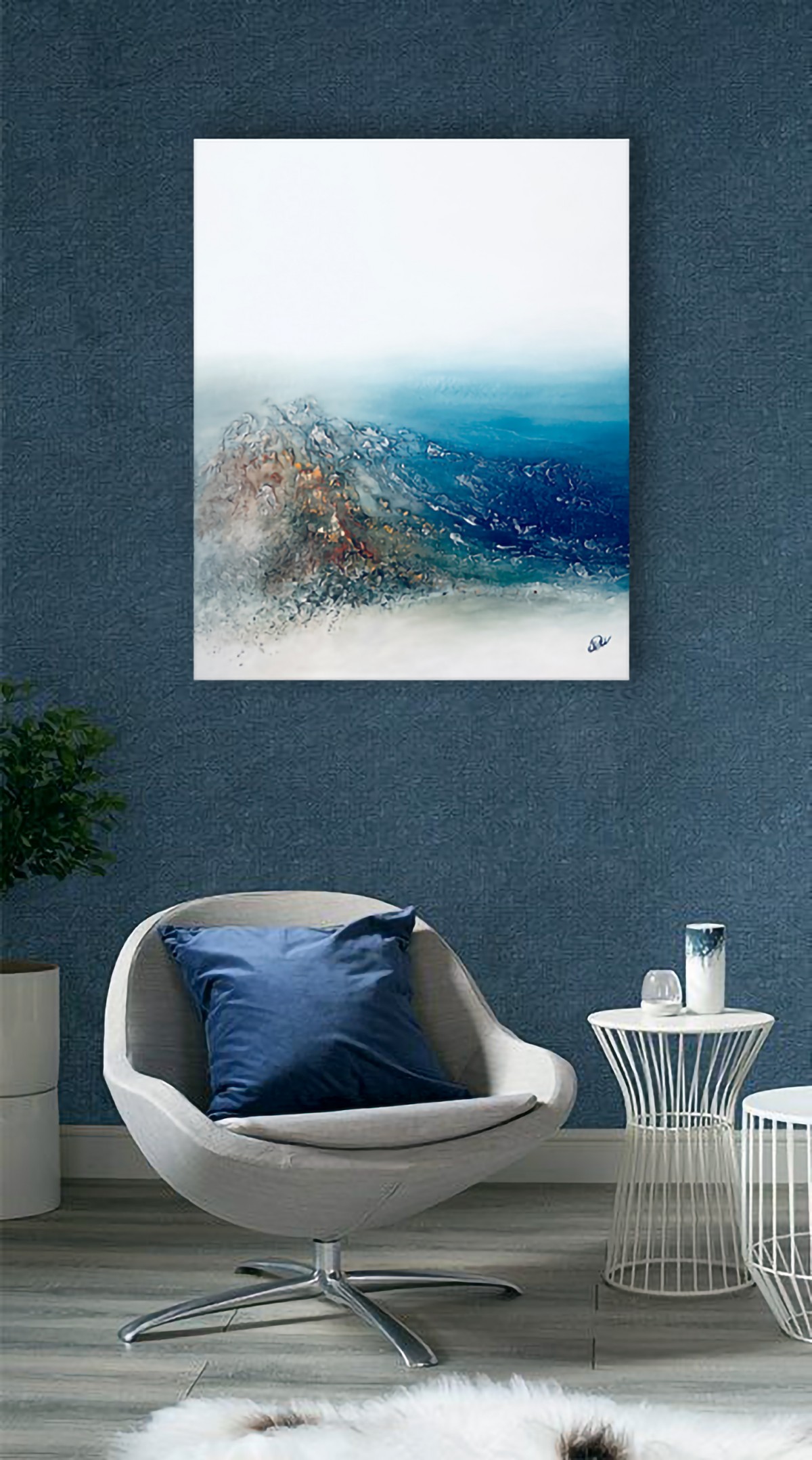 This painting was born from an inner need to find peace and lightness. While creating it, the artist sought to express the kind of silence where thoughts fade away. Soft blue and turquoise tones reflect a state of clarity and trust in life. Textured paste adds depth, as if the wind’s breath moves across the canvas. Acrylic transitions create a gentle glow — like the reflection of the sky on water.