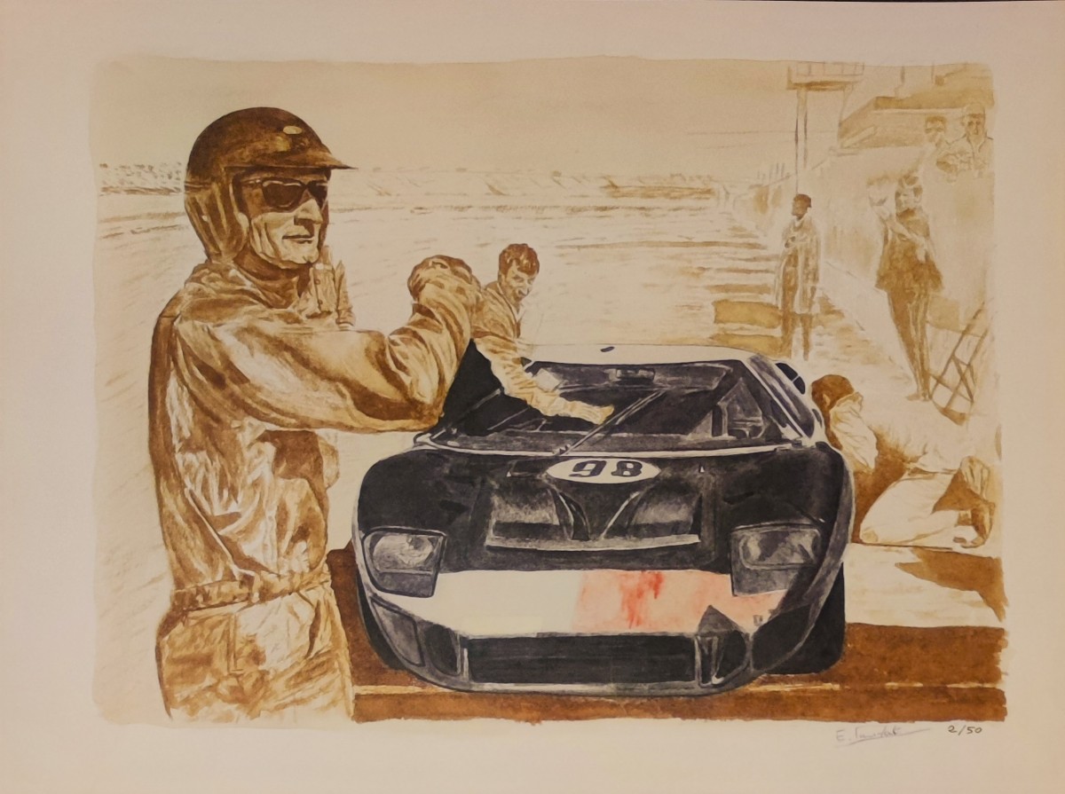 Reproduction de l'oeuvre au café, encre et aquarelle, ken Miles, 24 h de Daytona 1966