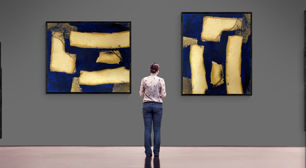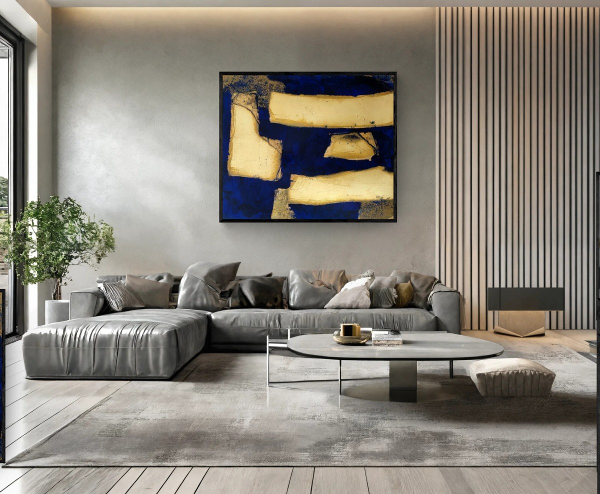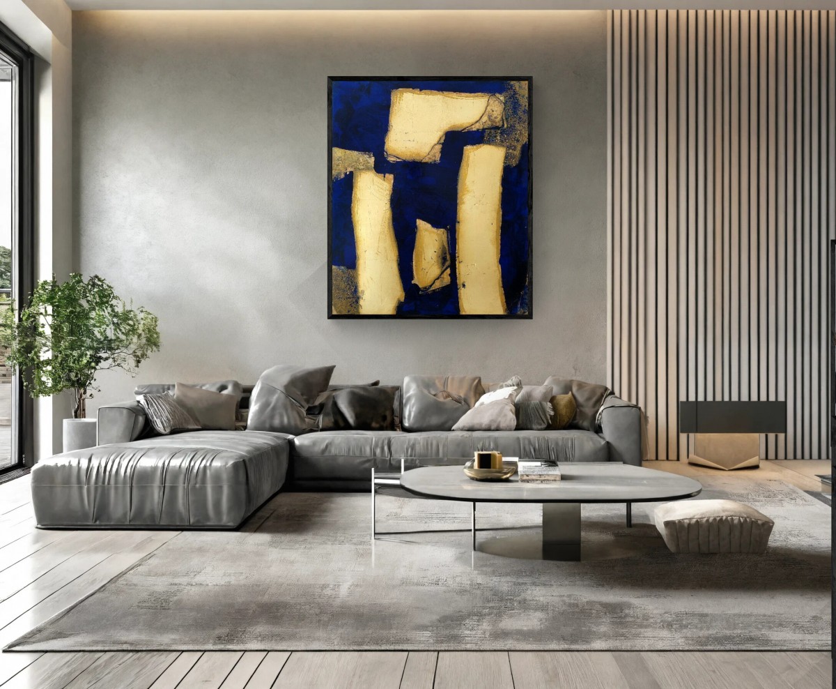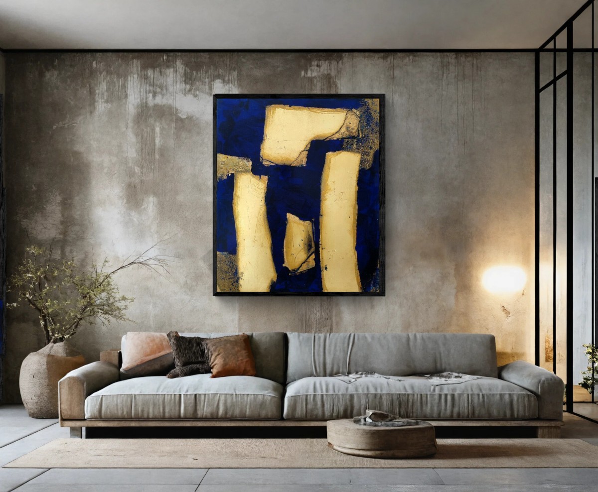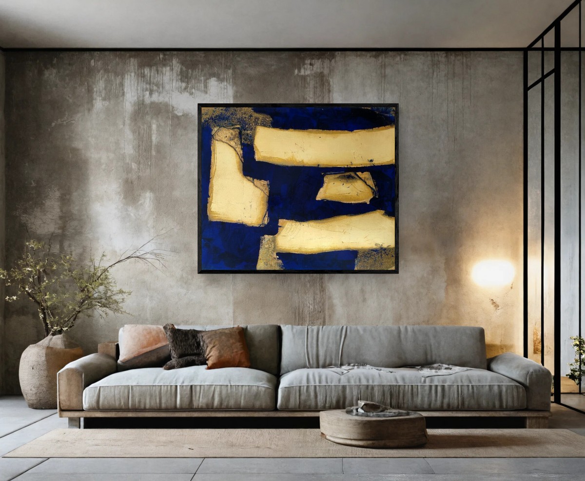 Les photos en situation sont des suggestions, elles ne sont pas à l’échelle, le tableau est signé au dos pour ne pas lui donner un sens d’accrochage imposé, le sens est libre et peut être changé.