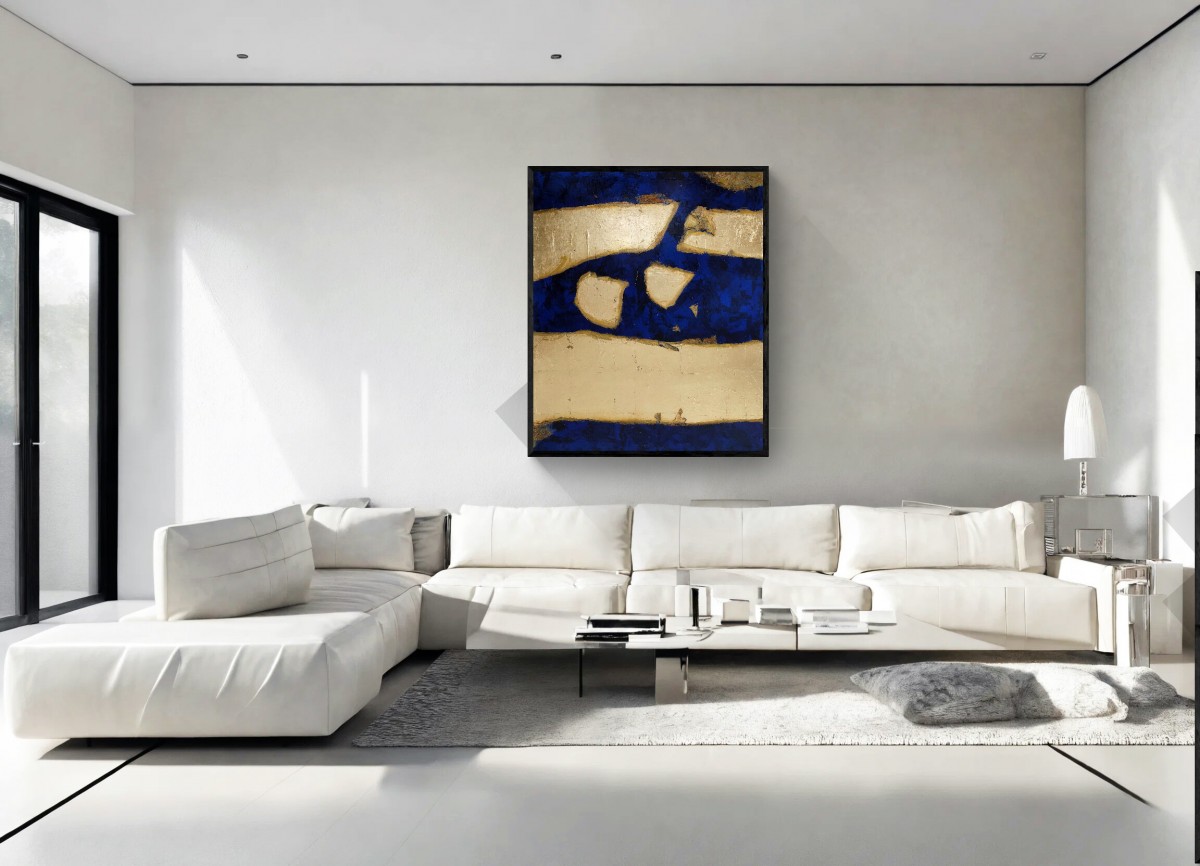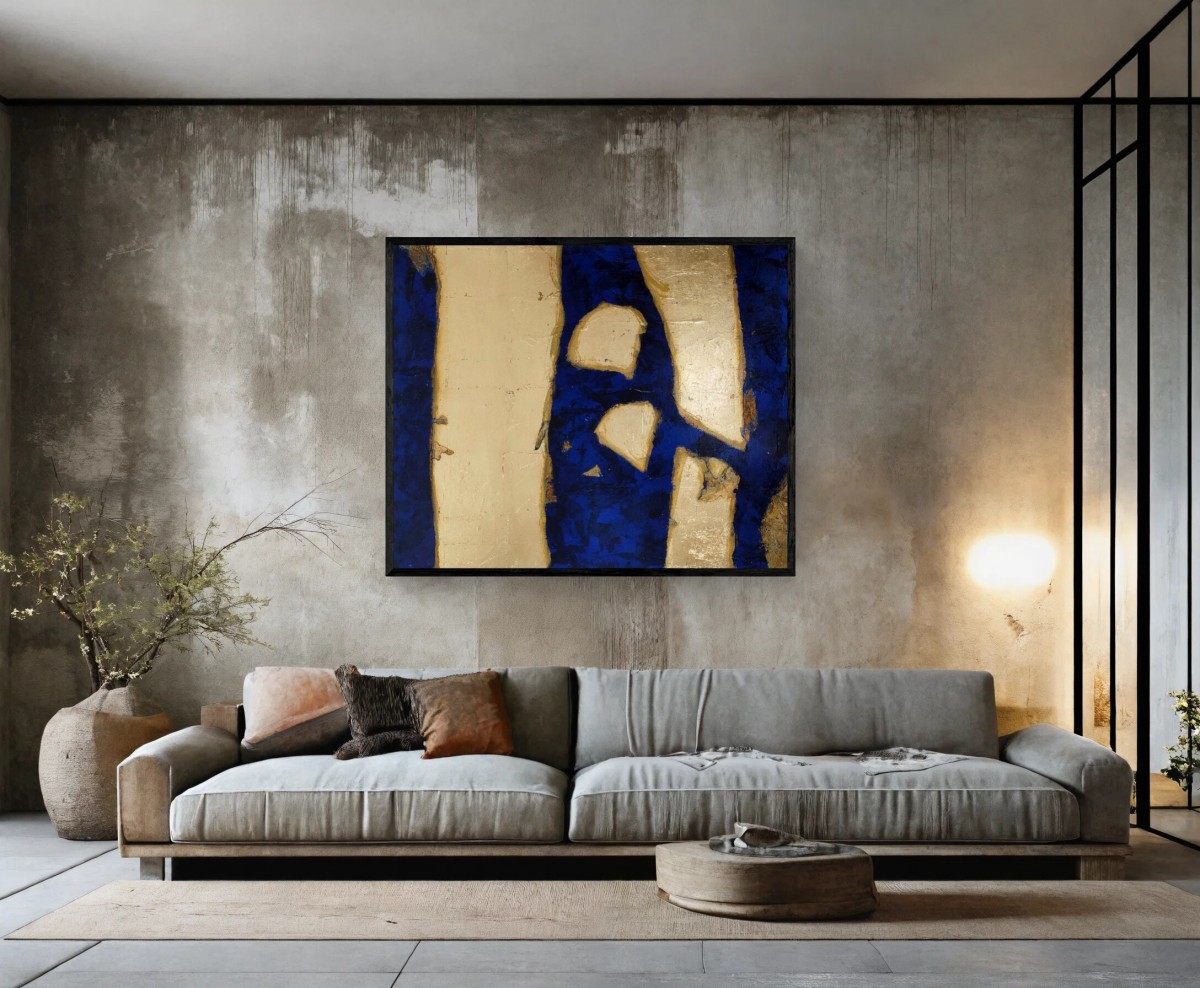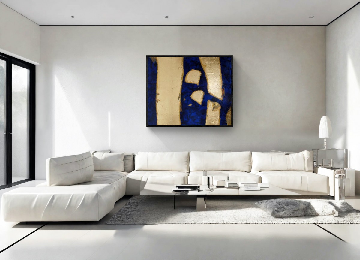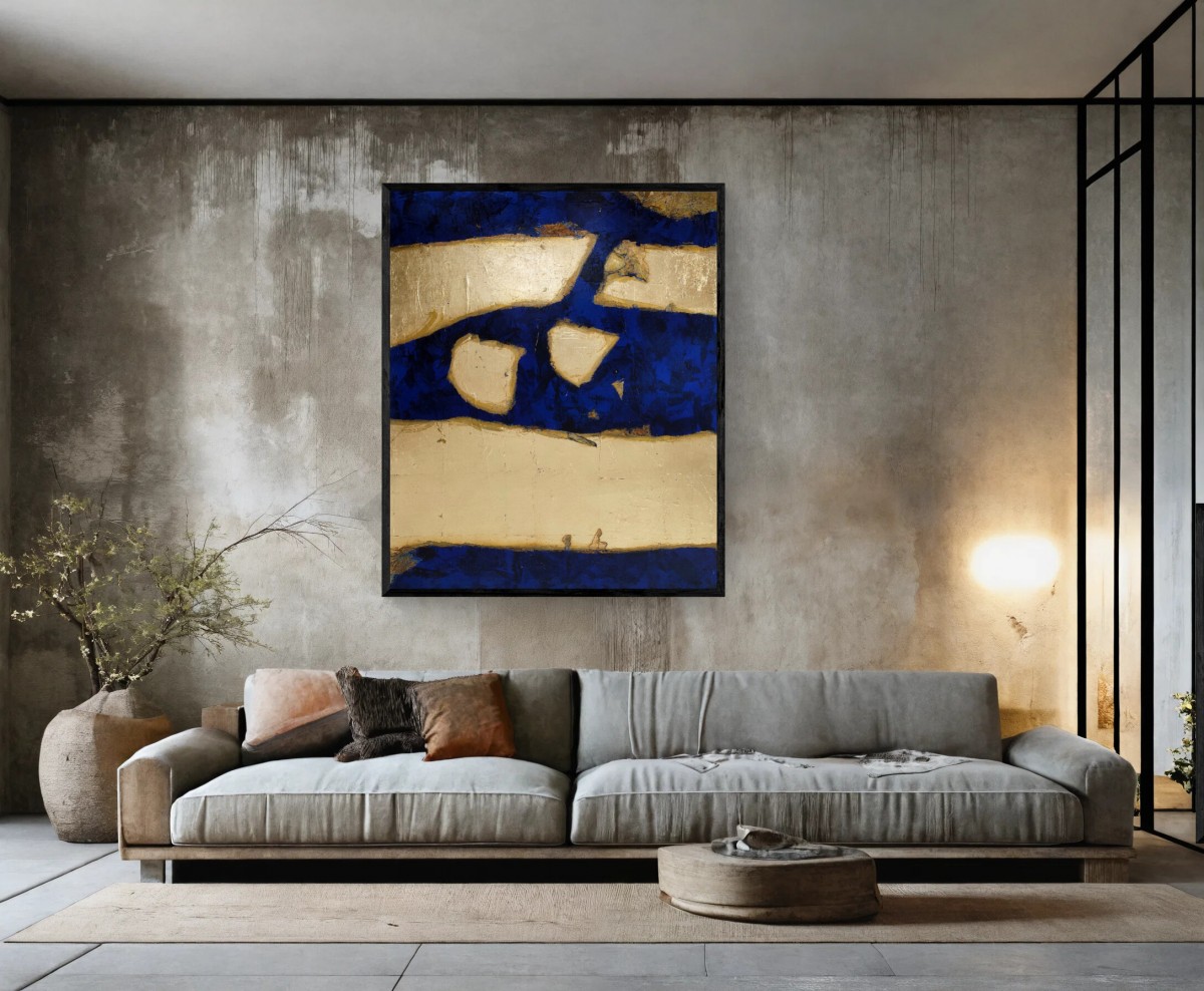 Les photos en situation sont des suggestions, elles ne sont pas obligatoirement à l’échelle, le tableau est signé au dos pour ne pas lui donner un sens d’accrochage imposé, le sens est libre et peut être changé.