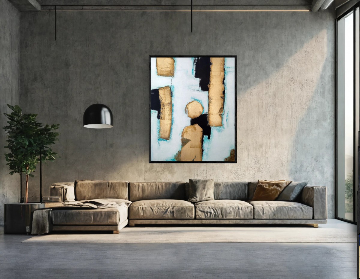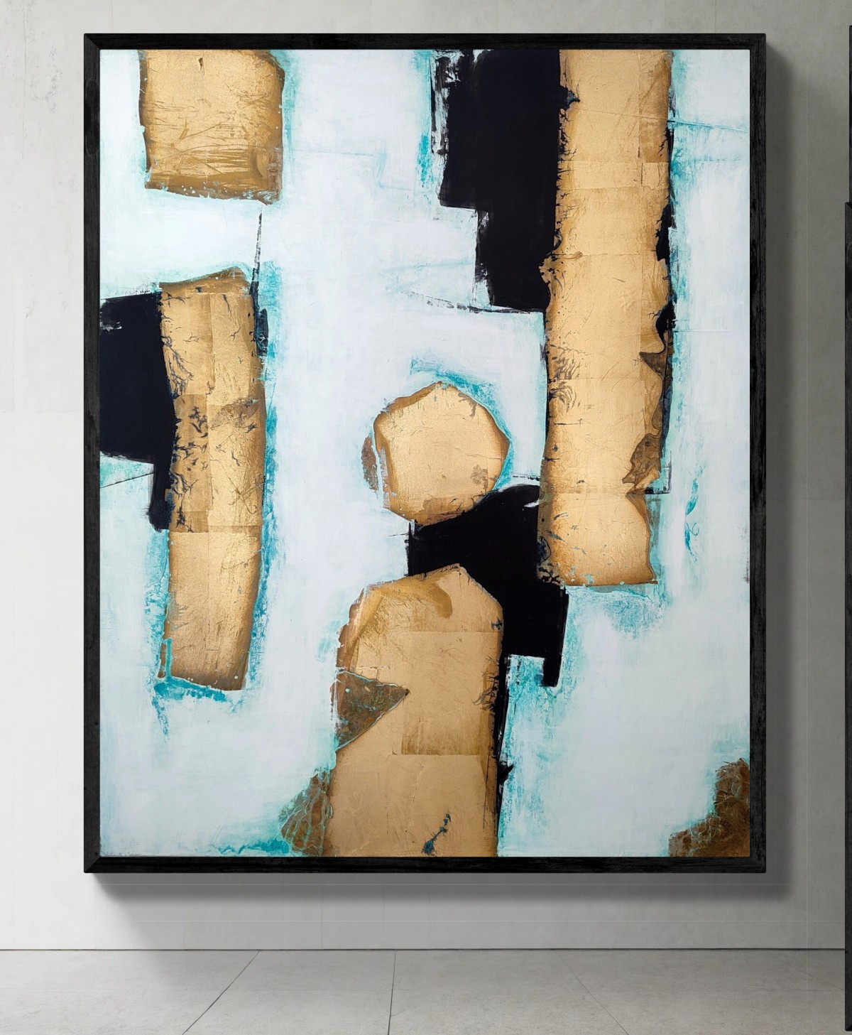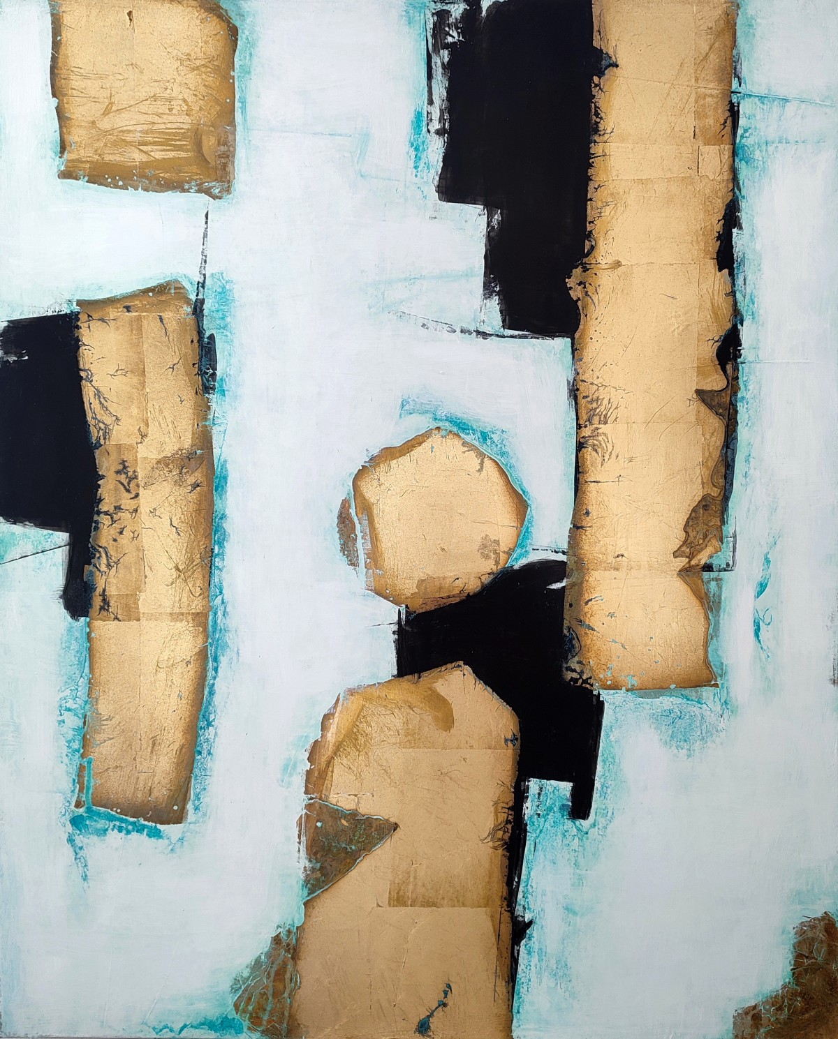 Le mariage du soleil et de la nuit, du classicisme à la Française et de l’abstraction lyrique très moderne . Feuille d'or et peinture sur toile 80/100 cm .