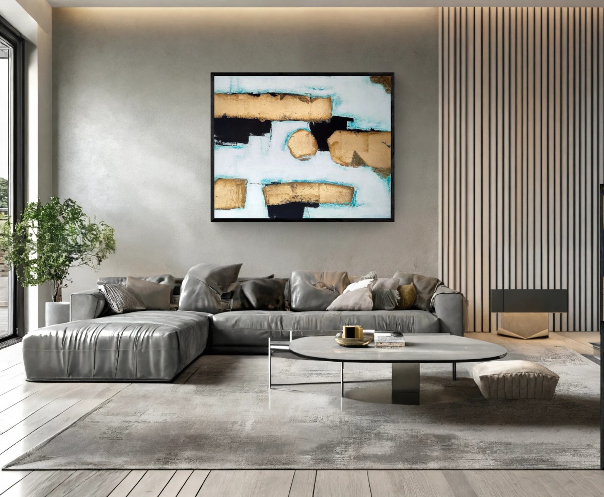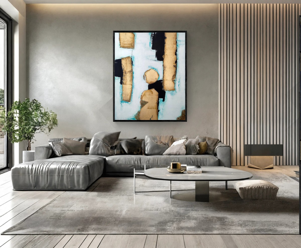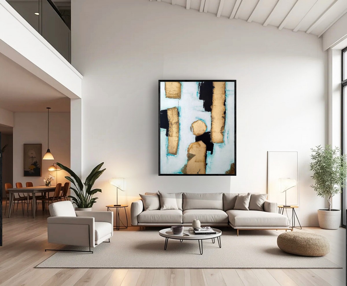 Les photos en situation sont des suggestions, elles ne sont pas obligatoirement à l’échelle, le tableau est signé au dos pour ne pas lui donner un sens d’accrochage imposé, le sens est libre et peut être changé.