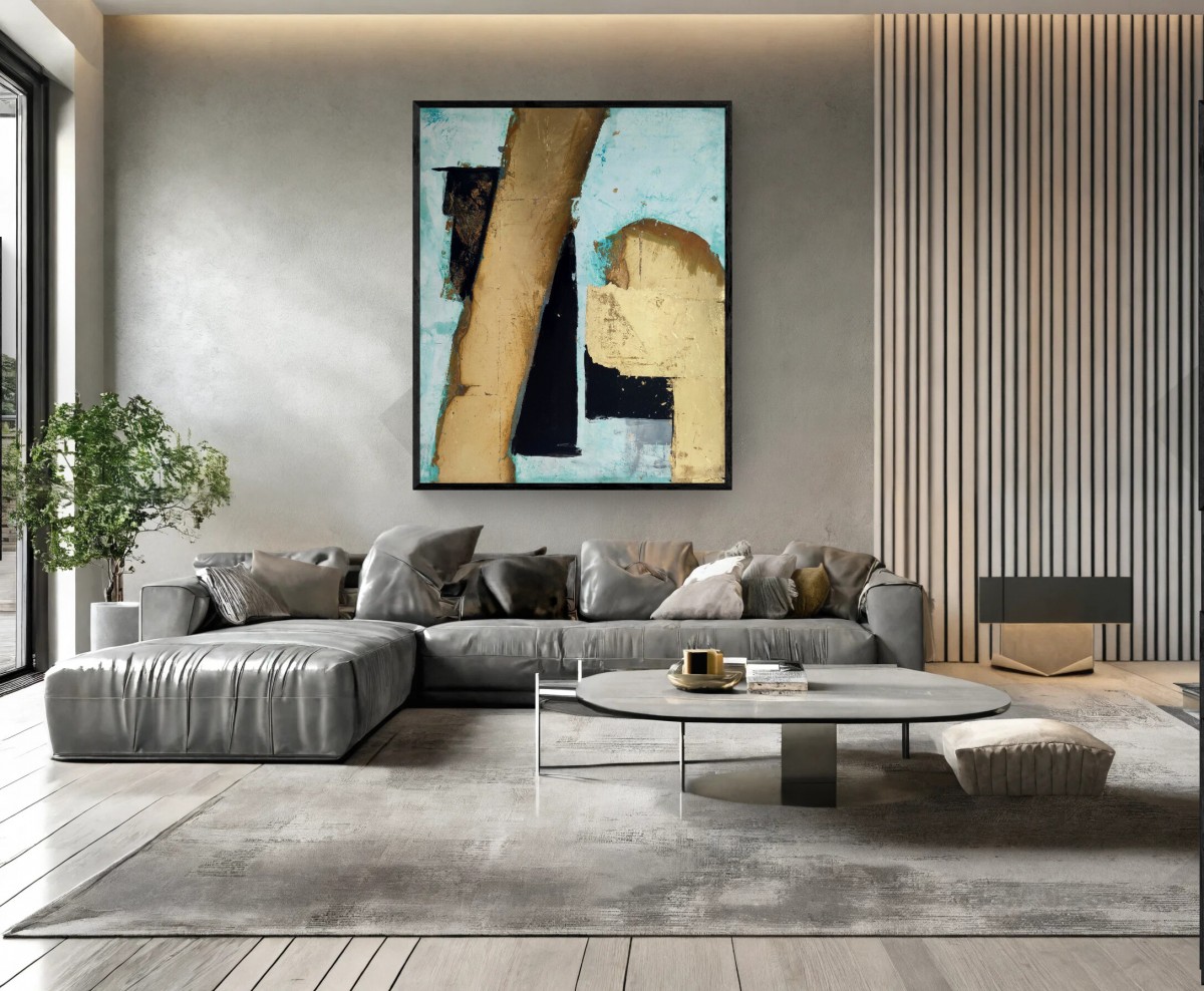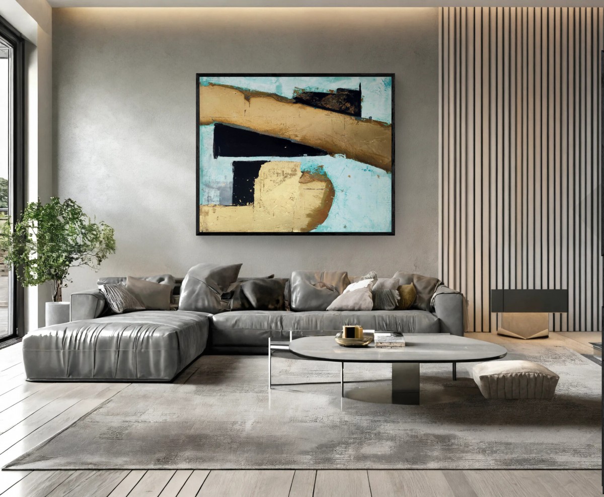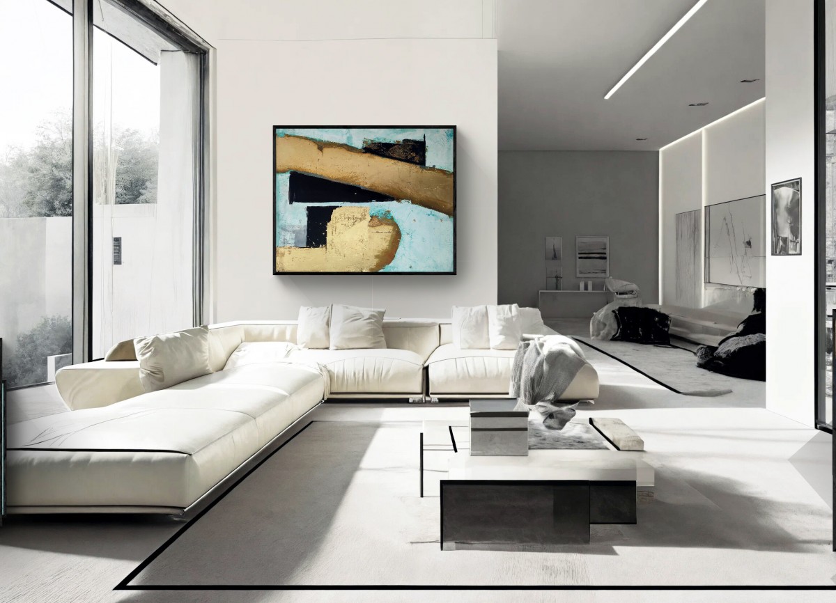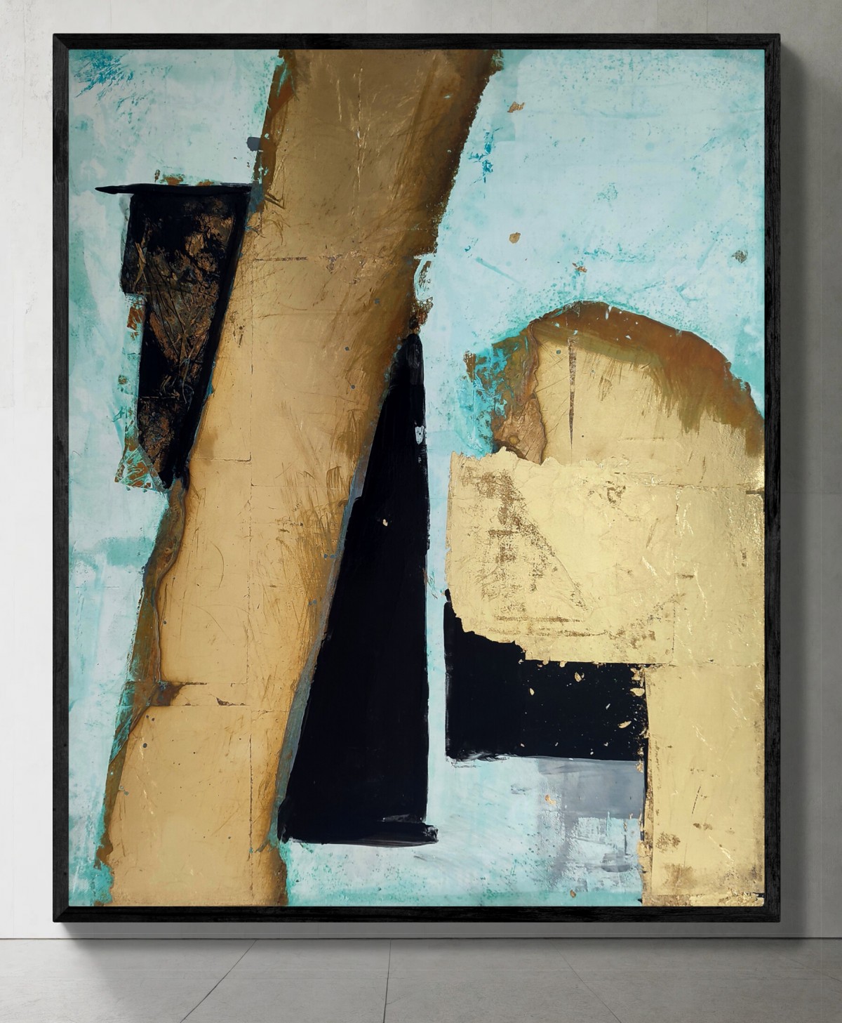 Peinture acrylique et feuille d'or sur toile, format 61/50 cm, une abstraction en or, noir et blanc et des pigments tuquoises .