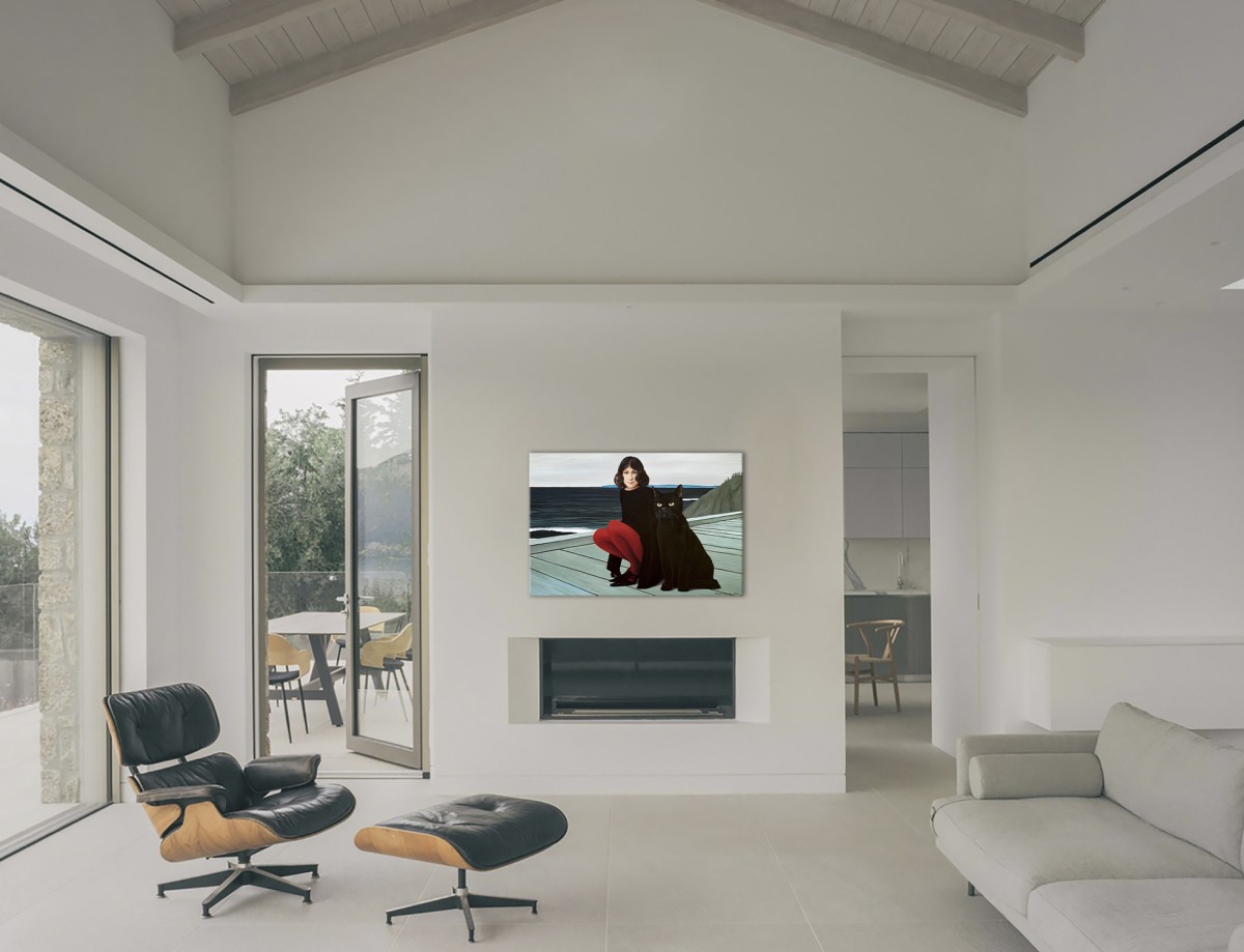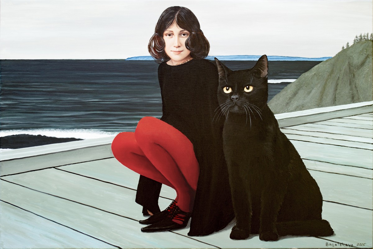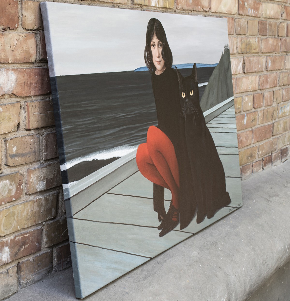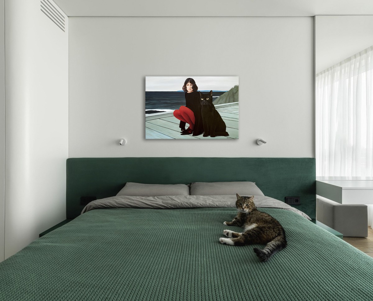 A striking contemporary figurative piece, this painting draws its strength from the tension between simplicity and depth. The scene: a girl in black, her vivid red tights glowing like a pulse of life, seated next to a colossal black cat whose eyes seem to hold untold mysteries. Behind them, the cold sea stretches to the horizon, carrying with it both calm and a sense of hidden adventure.