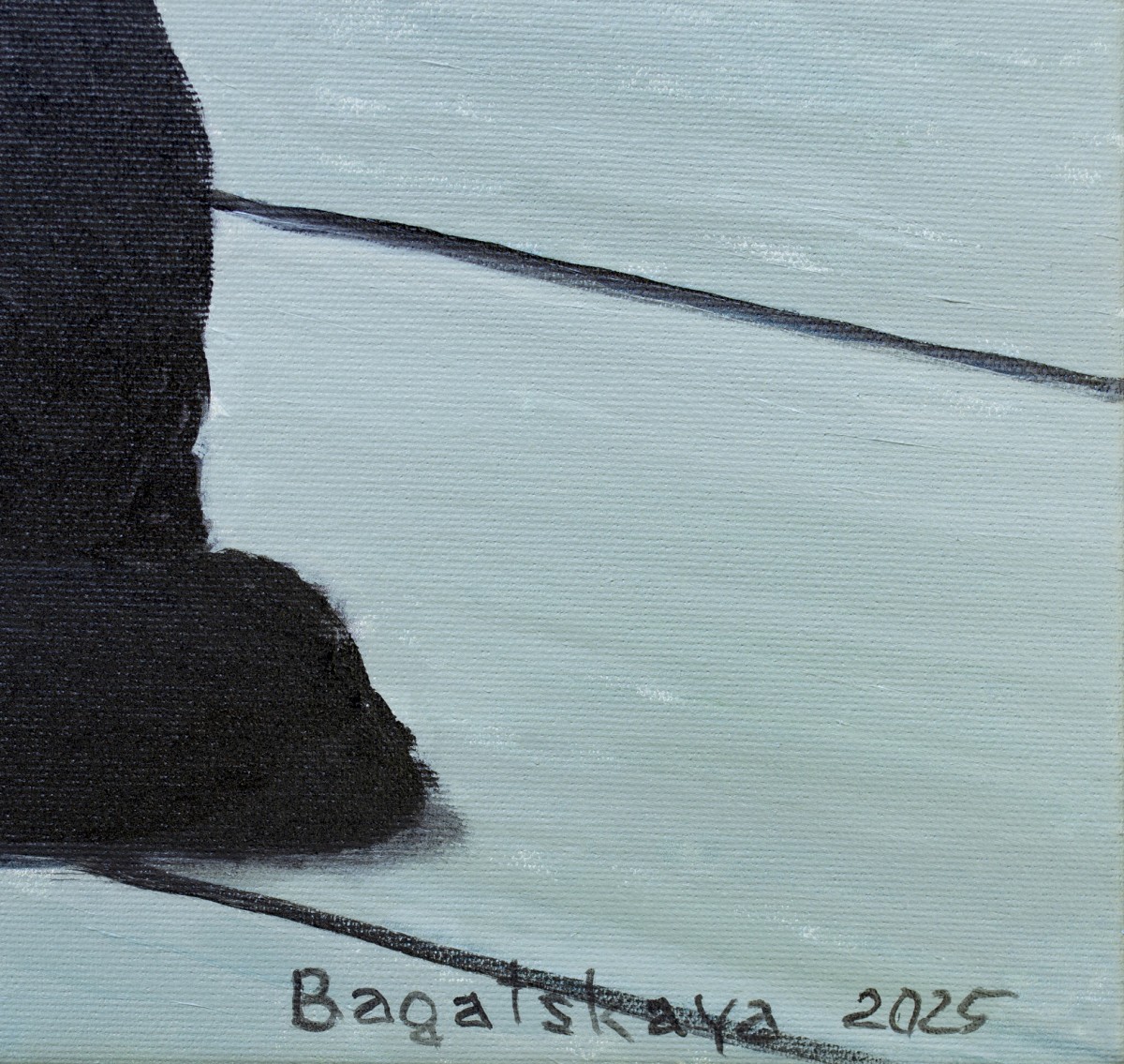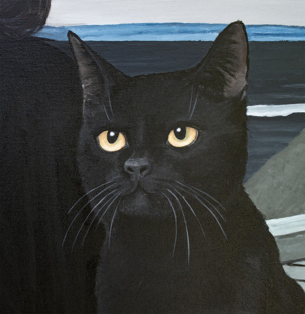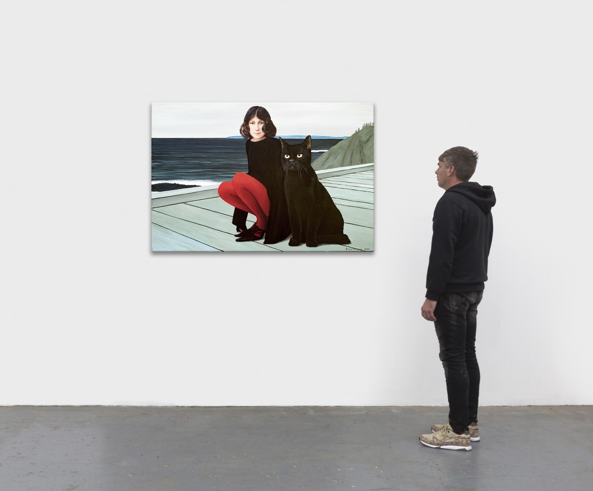 A striking contemporary figurative piece, this painting draws its strength from the tension between simplicity and depth. The scene: a girl in black, her vivid red tights glowing like a pulse of life, seated next to a colossal black cat whose eyes seem to hold untold mysteries. Behind them, the cold sea stretches to the horizon, carrying with it both calm and a sense of hidden adventure.