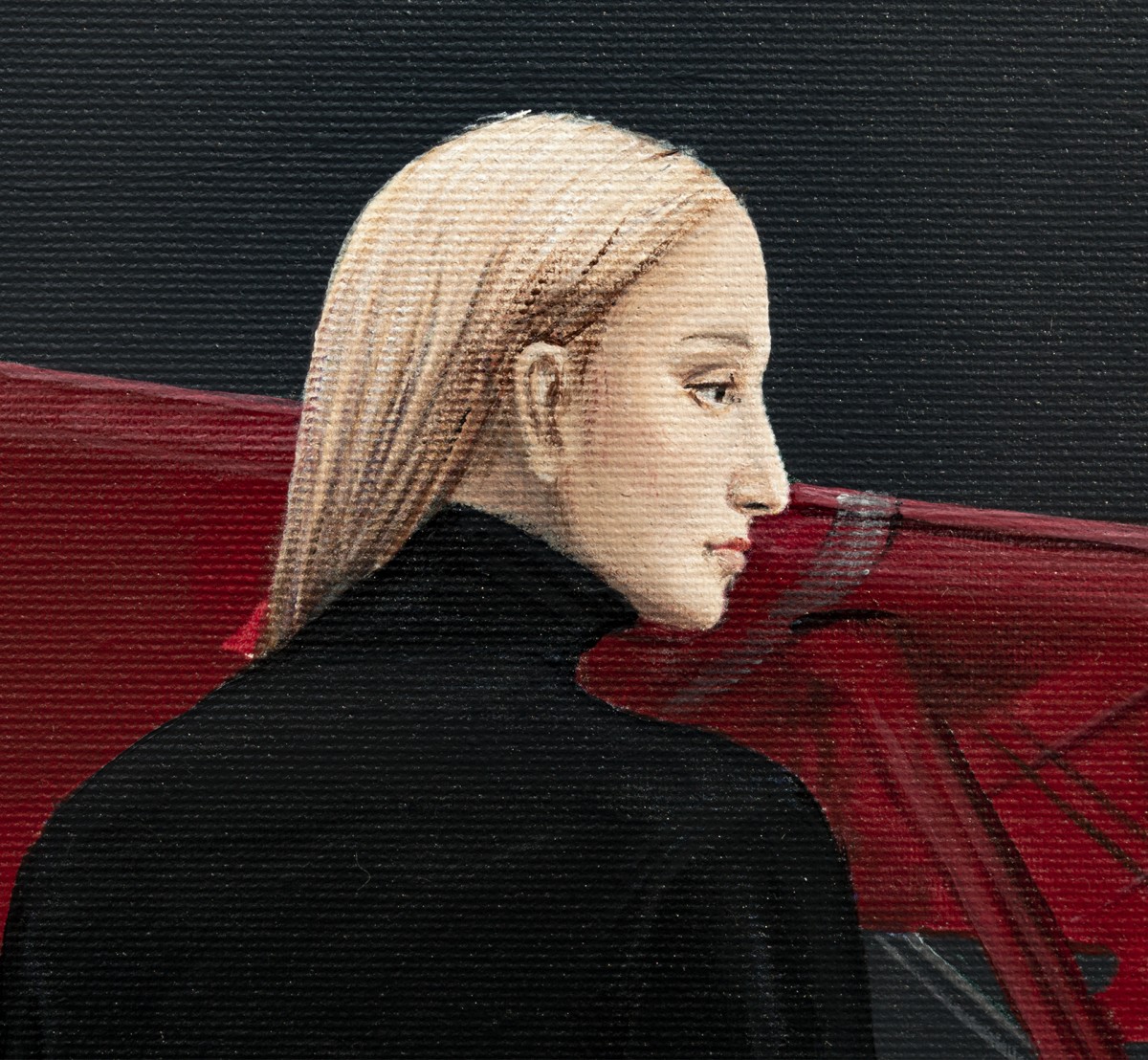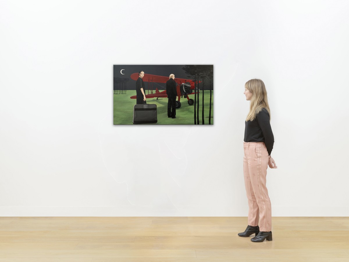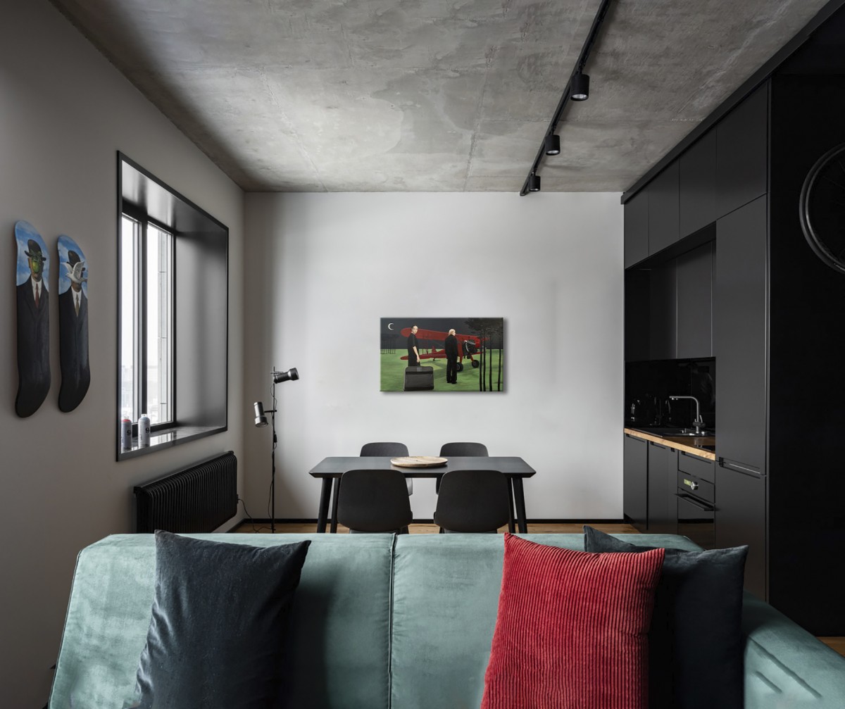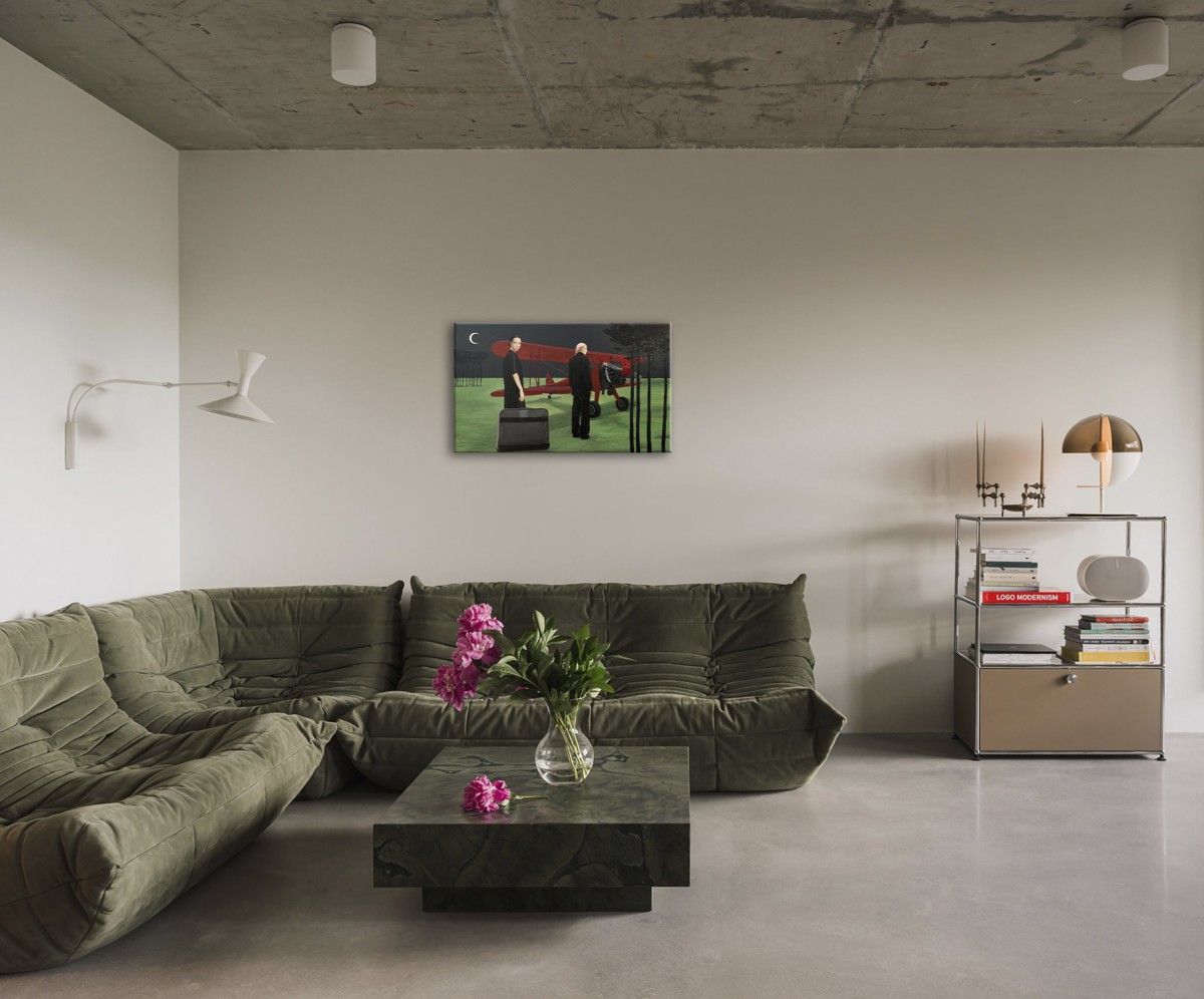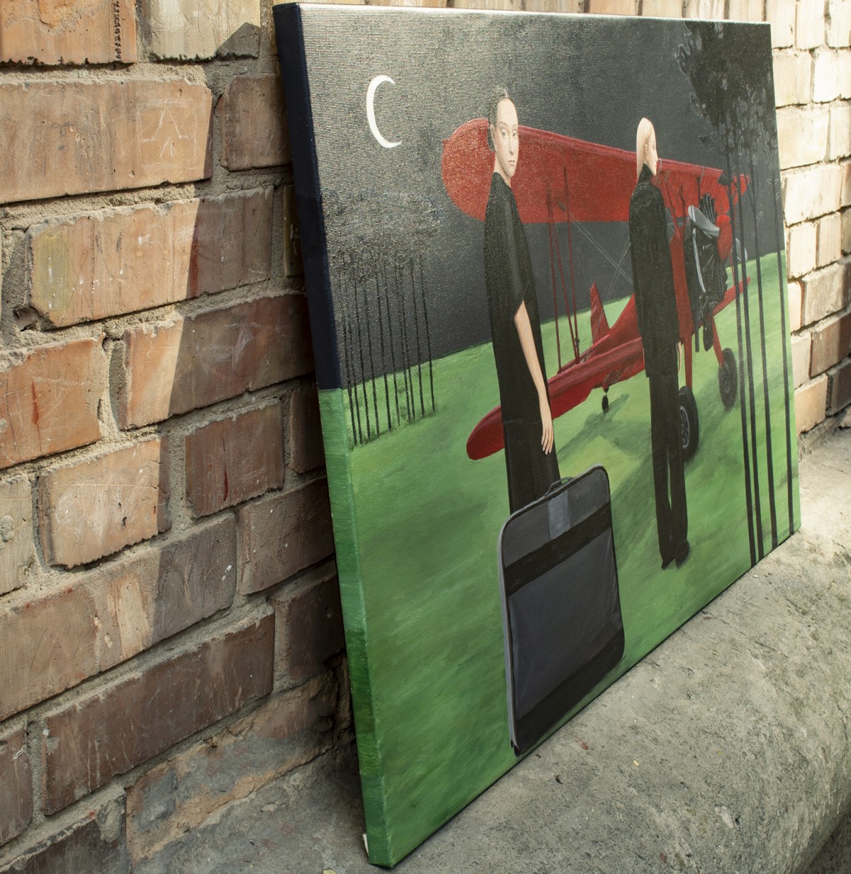 Beneath a crescent moon, two figures dressed in black stand beside a vivid red biplane, captured in the stillness before departure. One glances back toward us, bridging viewer and story, while the other faces the plane, fixed on what lies ahead. A single suitcase rests nearby, suggesting escape, farewell, or a journey yet undefined. The minimalist setting, bold contrasts, and quiet tension evoke themes of transition, memory, and courage. Blending realism with a touch of the surreal, the scene invites reflection on the threshold between earth and sky, past and future.