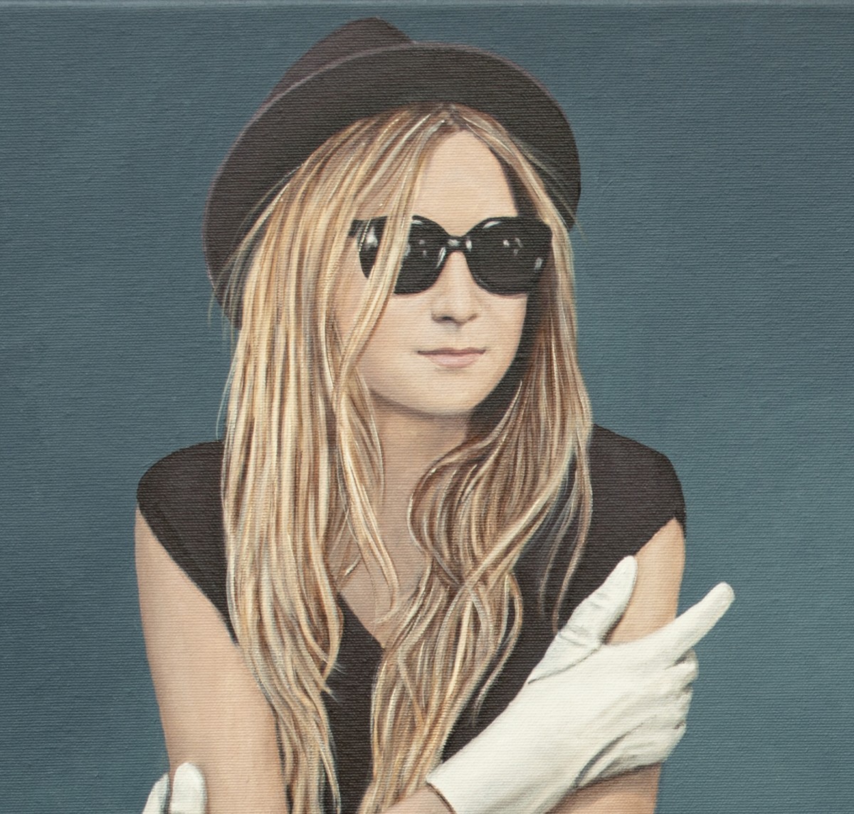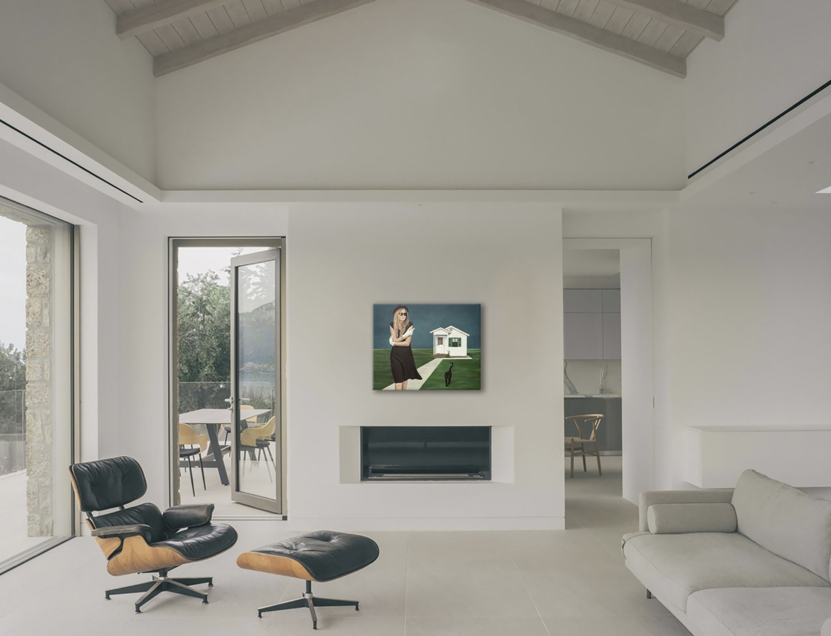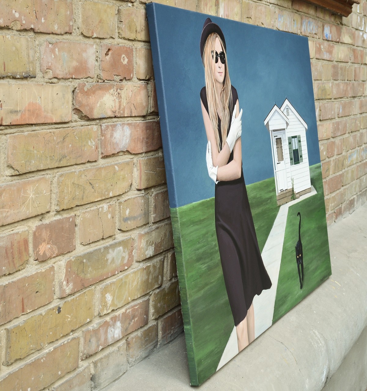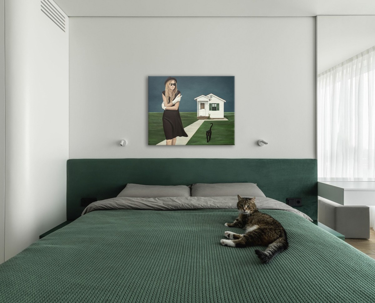 A mysterious woman in a black dress and hat stands on a quiet lawn, adjusting her white gloves as though preparing for a hidden ritual. Behind her, a small white house offers contrast—stability against enigma. A black cat steps forward, reminiscent of my beloved Ivan, who once greeted me at the door and saw me off, bringing a layer of warmth, memory, and quiet magic to the scene. The deep blue sky intensifies the cinematic mood, while her sunglasses conceal unspoken emotions. This painting merges realism with surreal undertones, becoming both a puzzle and a personal story for the collector to unravel.