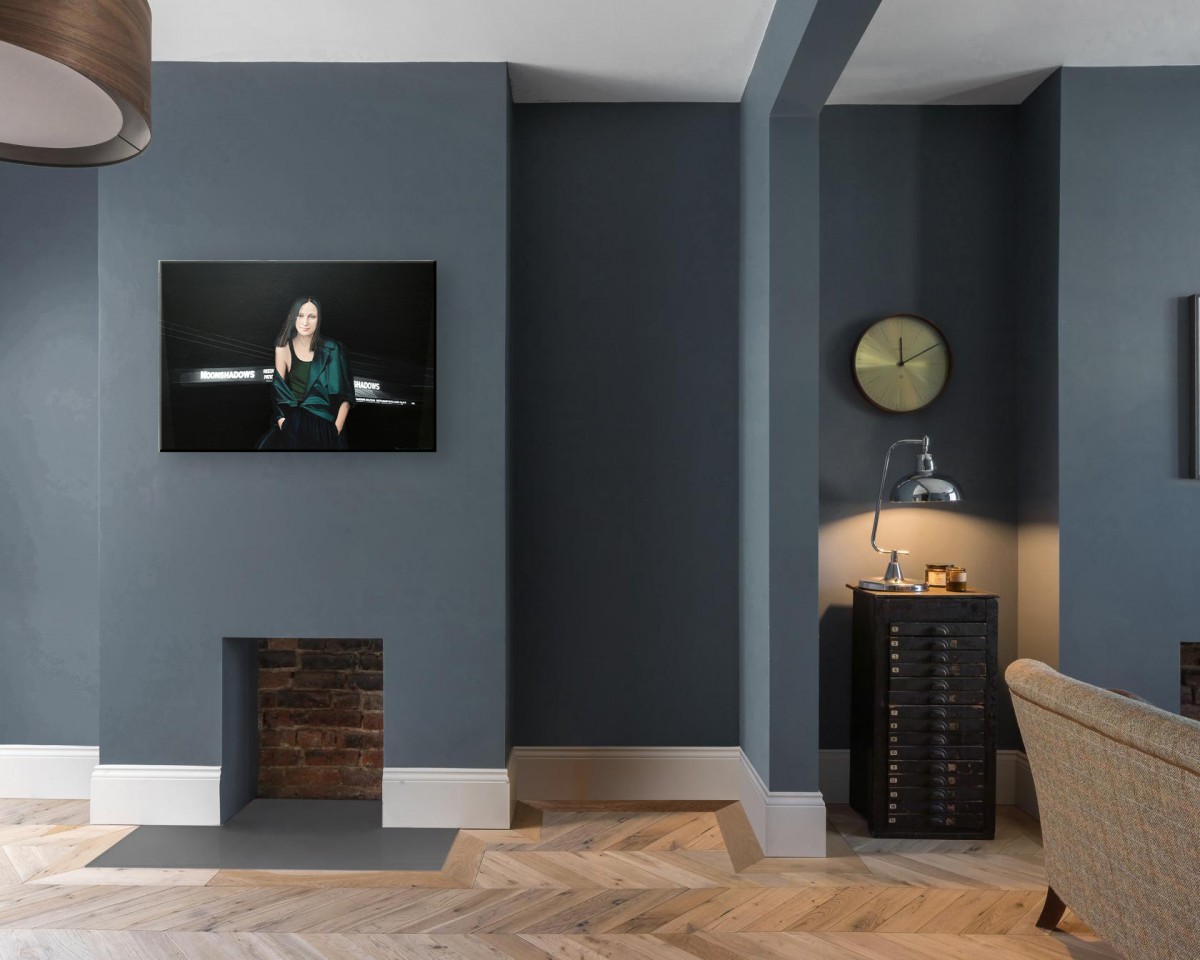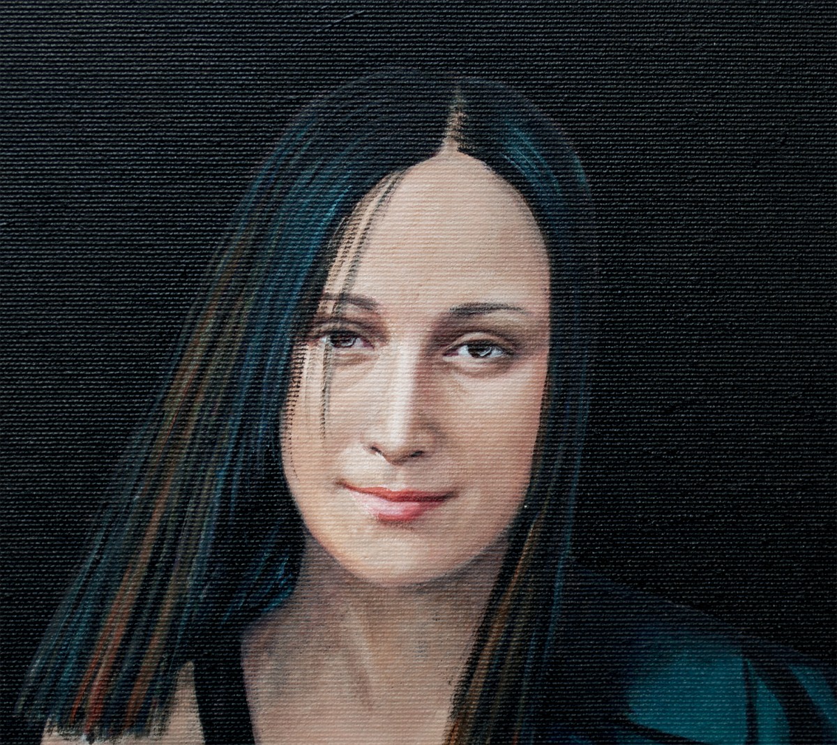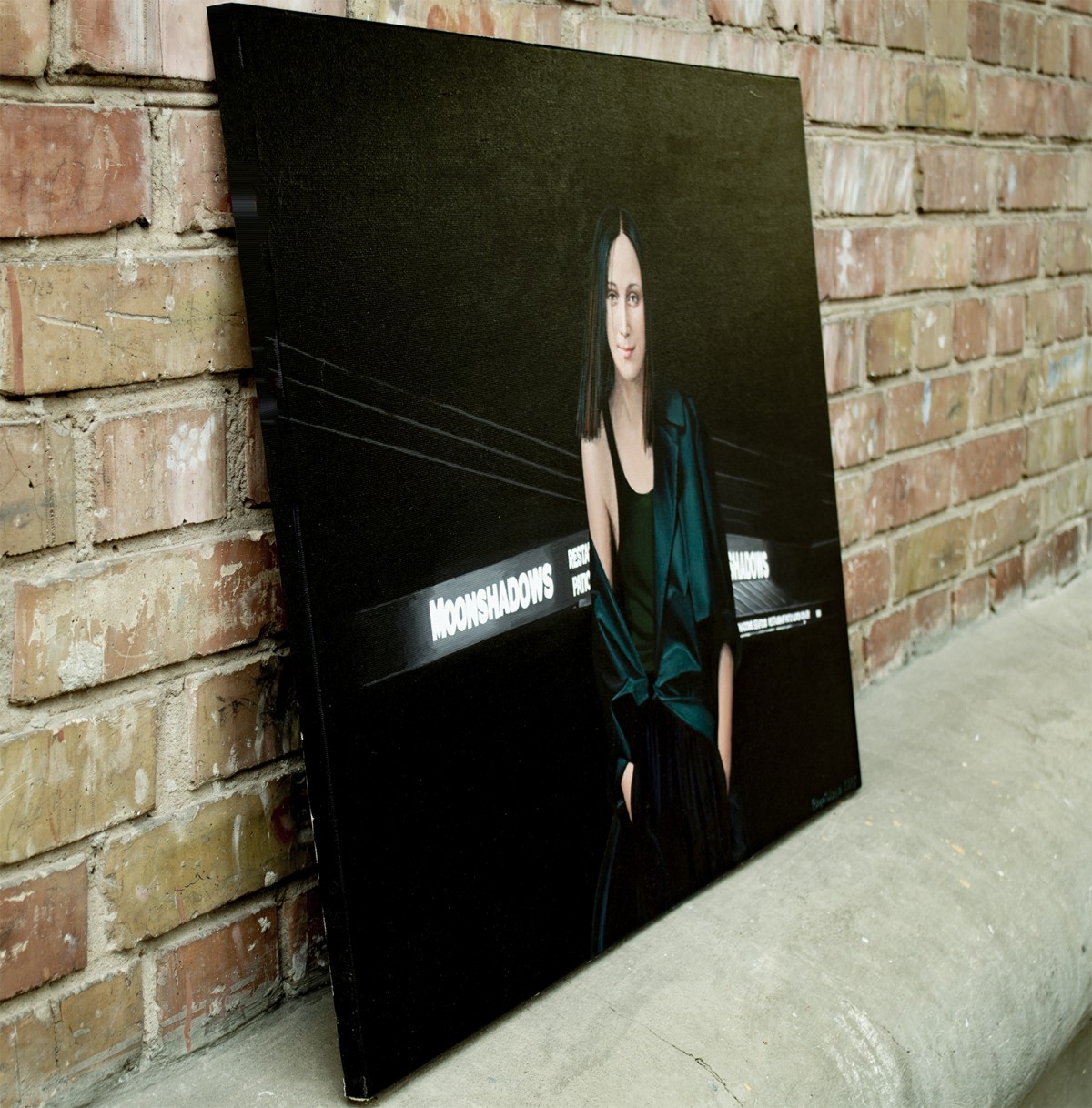 This painting presents a captivating nocturnal atmosphere shaped around a poised young woman illuminated by the subtle glow of the “Moonshadows” sign. The contrast between her softly lit face and the surrounding velvet-black space creates an immediate emotional pull inviting the viewer into a scene. Her emerald jacket, executed with meticulous precision, becomes a visual bridge between realism and mood — adding an elegant tension. Here, shadow and light engage in a deliberate dialogue. The subject’s calm confidence and the surrounding stillness create a psychological presence that resonates deeply, prompting personal interpretation and emotional reflection.