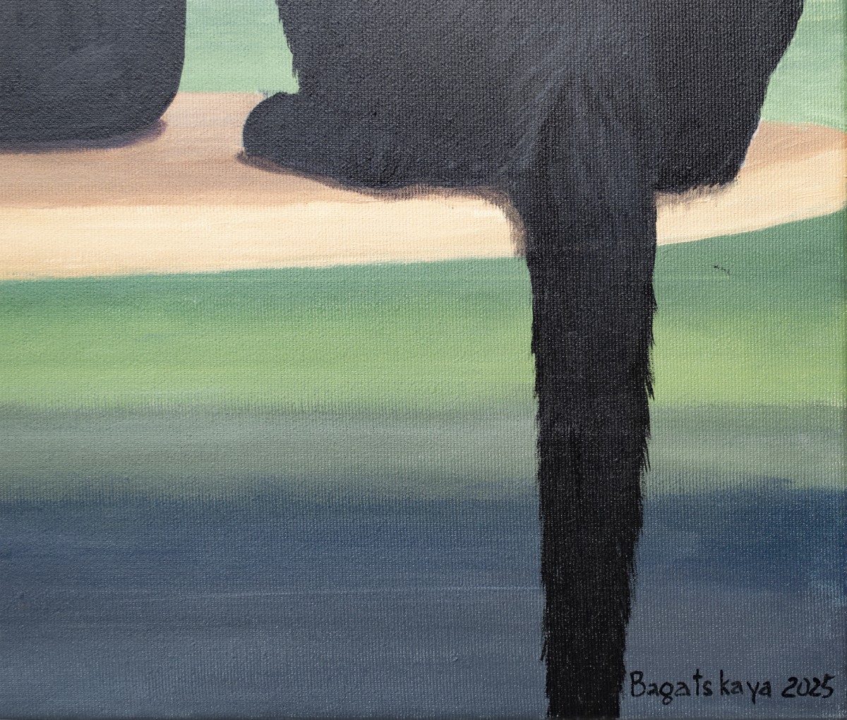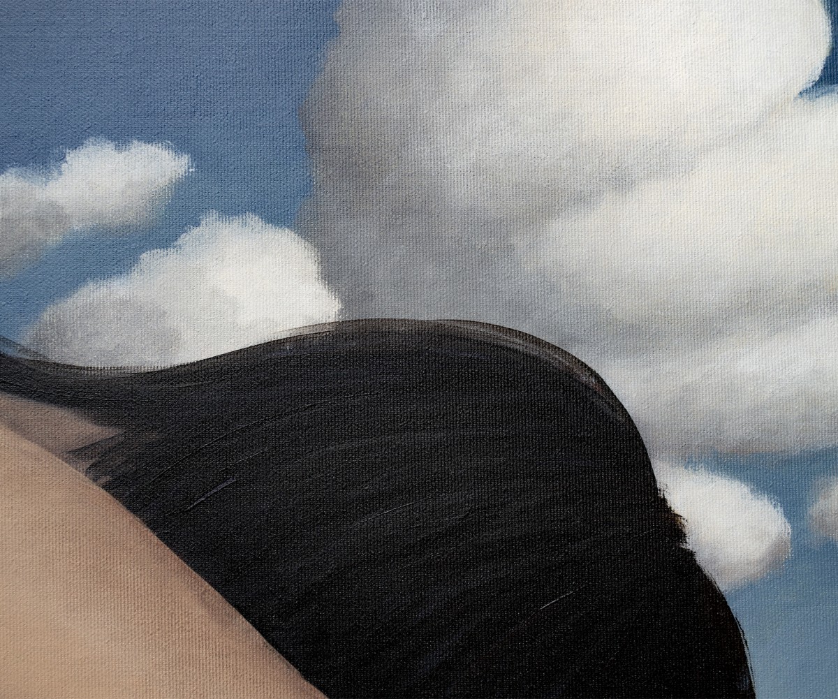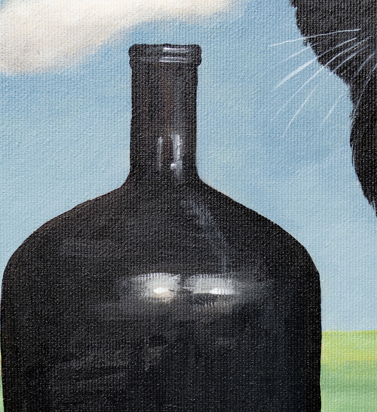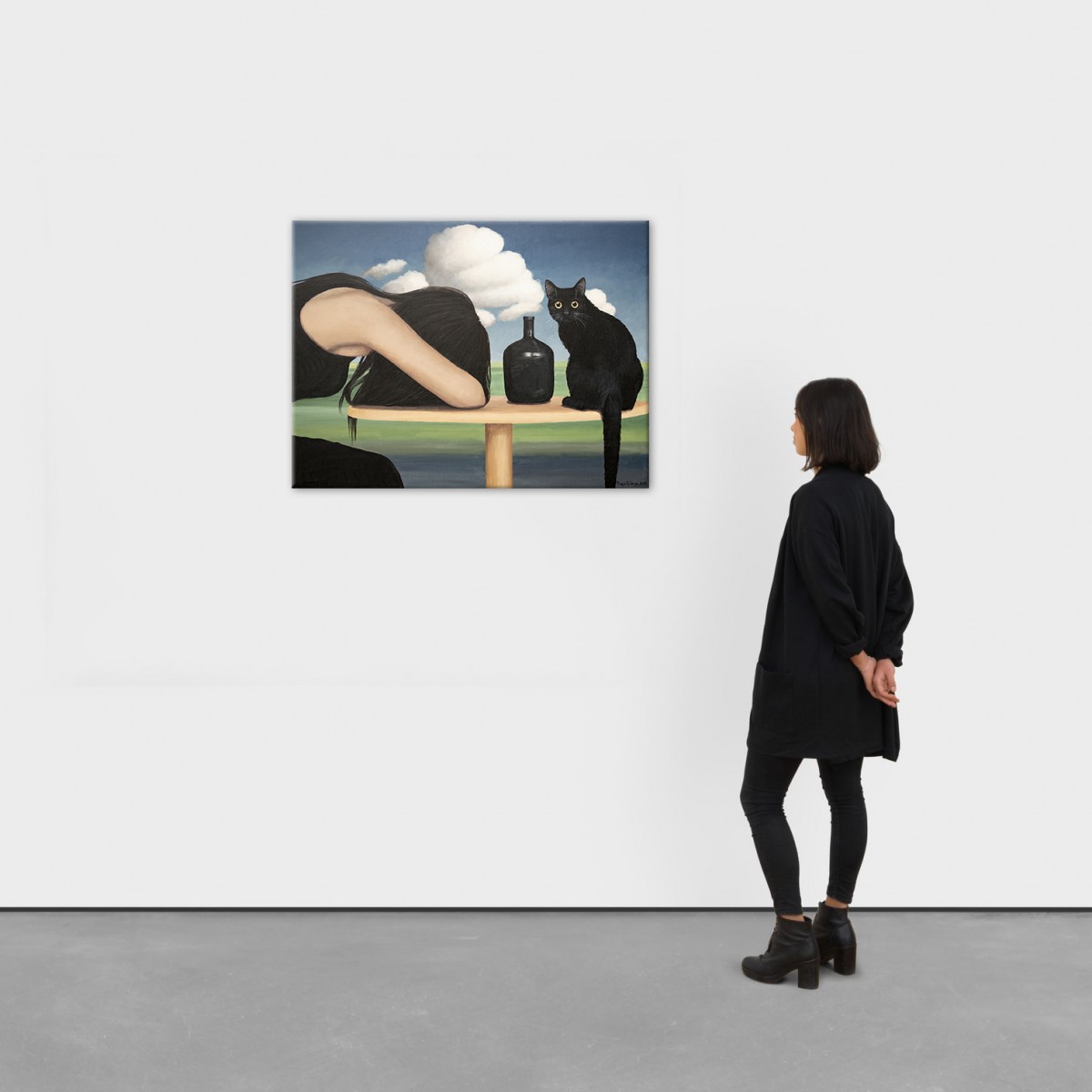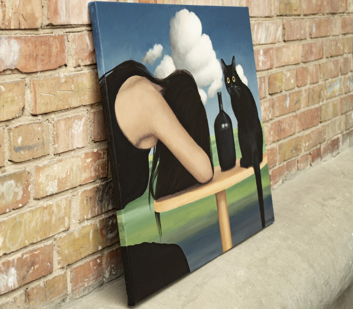 In "What?.." a poetic and surreal moment is captured. Beside her, a black cat with striking golden eyes observes the world with enigmatic calm. The open blue sky and sculpted white clouds create a sense of stillness. A dark bottle on the table adds symbolic depth.