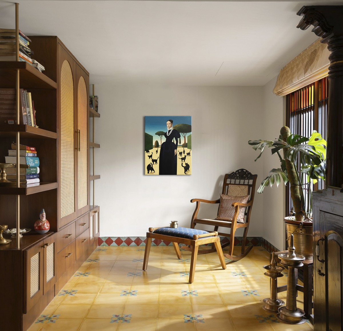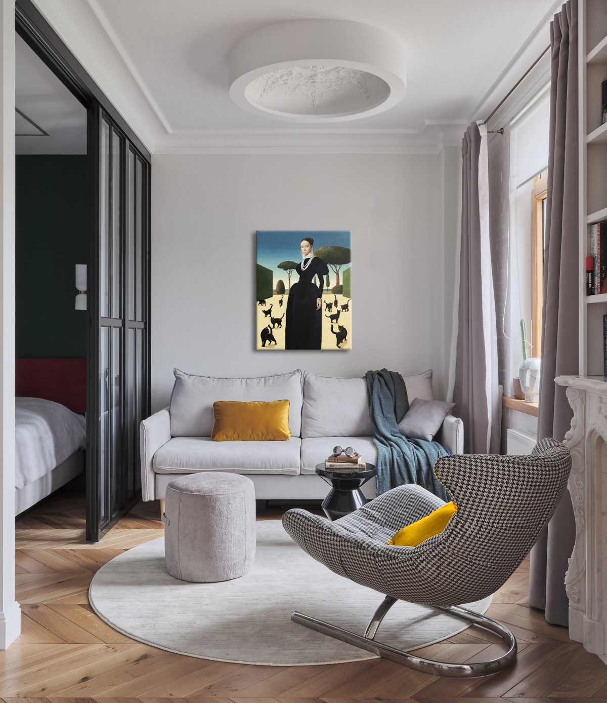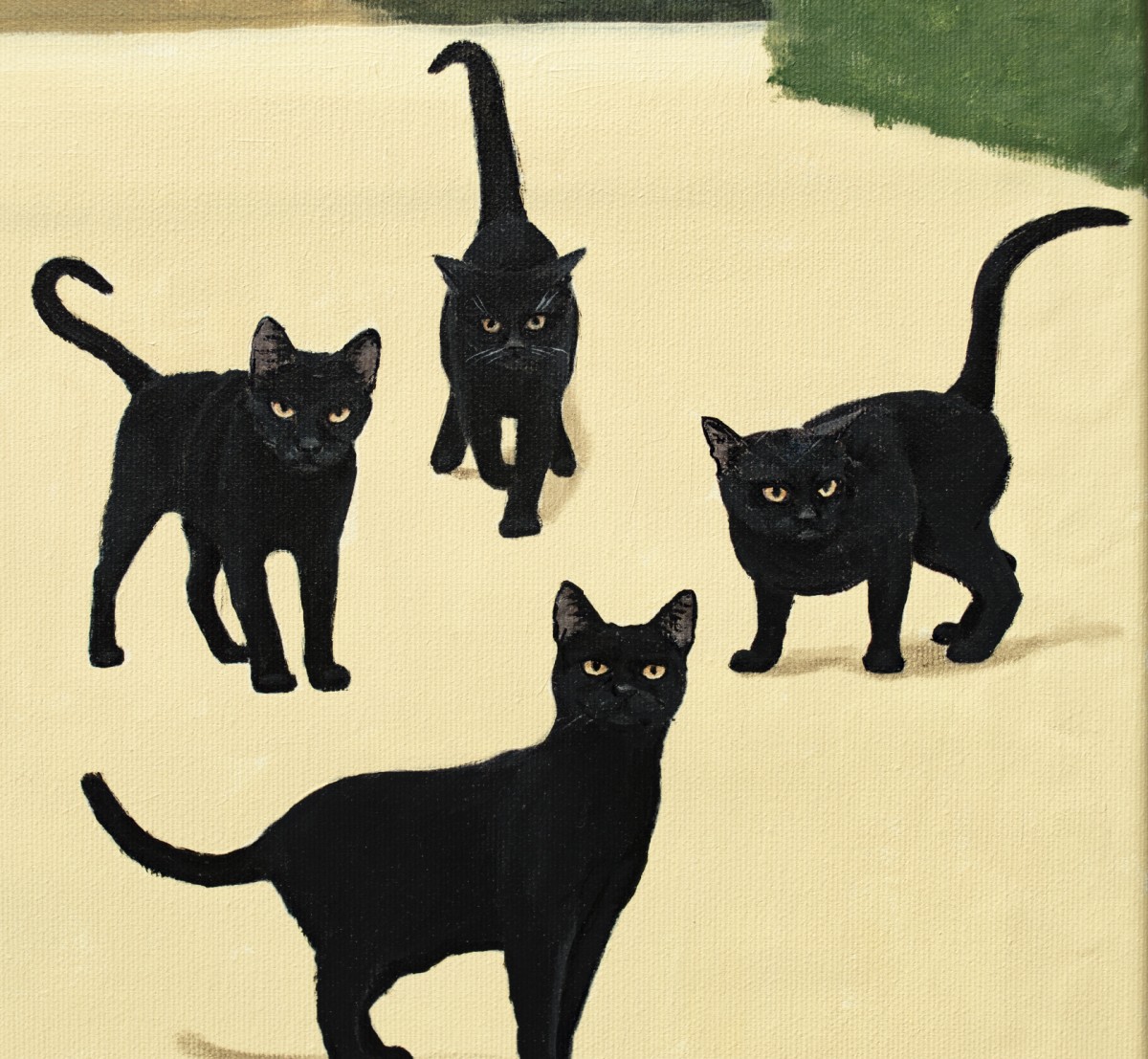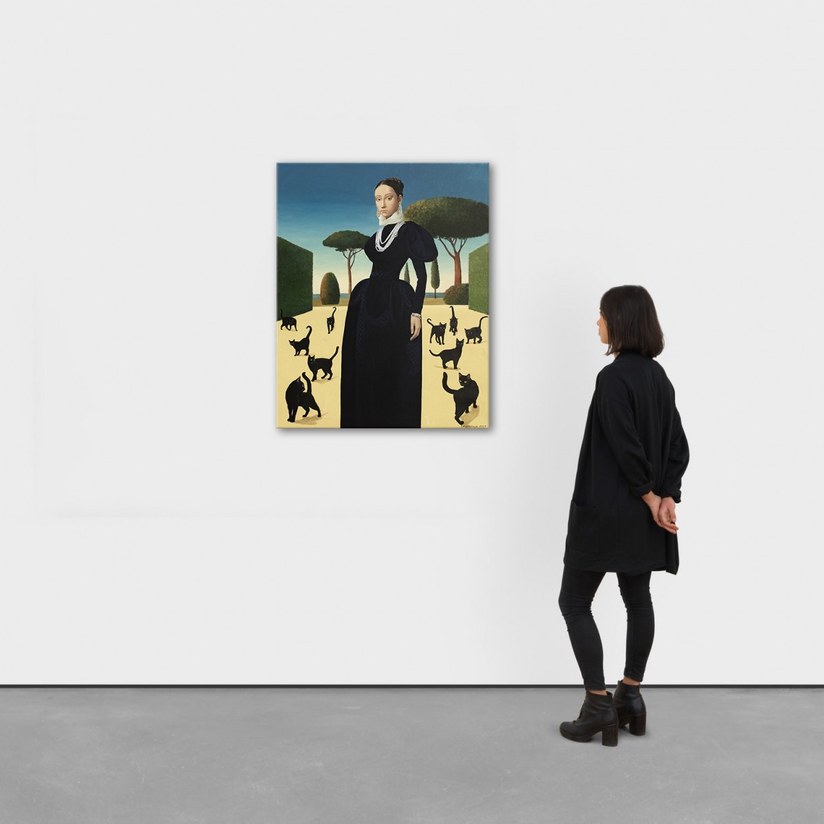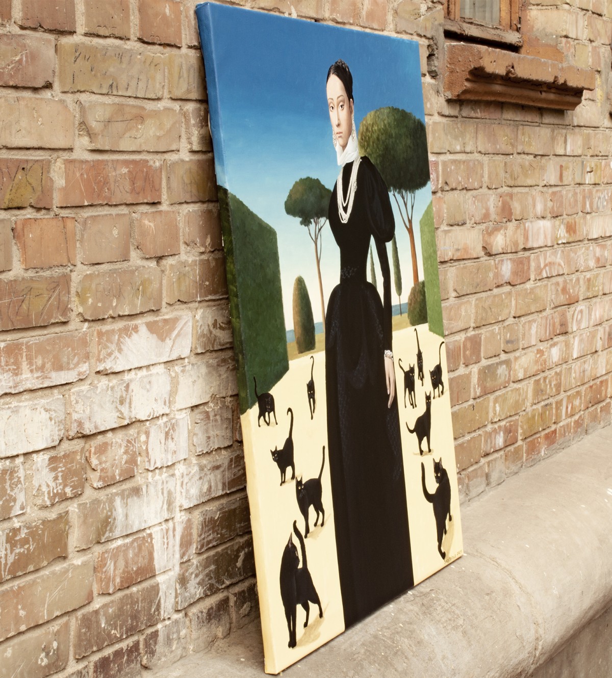 A striking painting blending Renaissance poise with surreal symbolism. A dignified woman in a dark gown stands in a sunlit garden surrounded by black cats — timeless emblems of mystery and independence. The scene evokes a sense of calm power, elegance, and otherworldly grace. Its refined balance of composition, light, and symbolism draws the viewer into a dreamlike narrative. Dutch acrylic paints Amsterdam tm and Italian canvas by Unico were used. The finish is satin varnish, and the edges are painted in the background color. This painting is created on a pre-stretched canvas on a wooden frame. It is carefully packed in a cardboard box with layers of bubble wrap. The artwork is signed and accompanied by a certificate of authenticity.