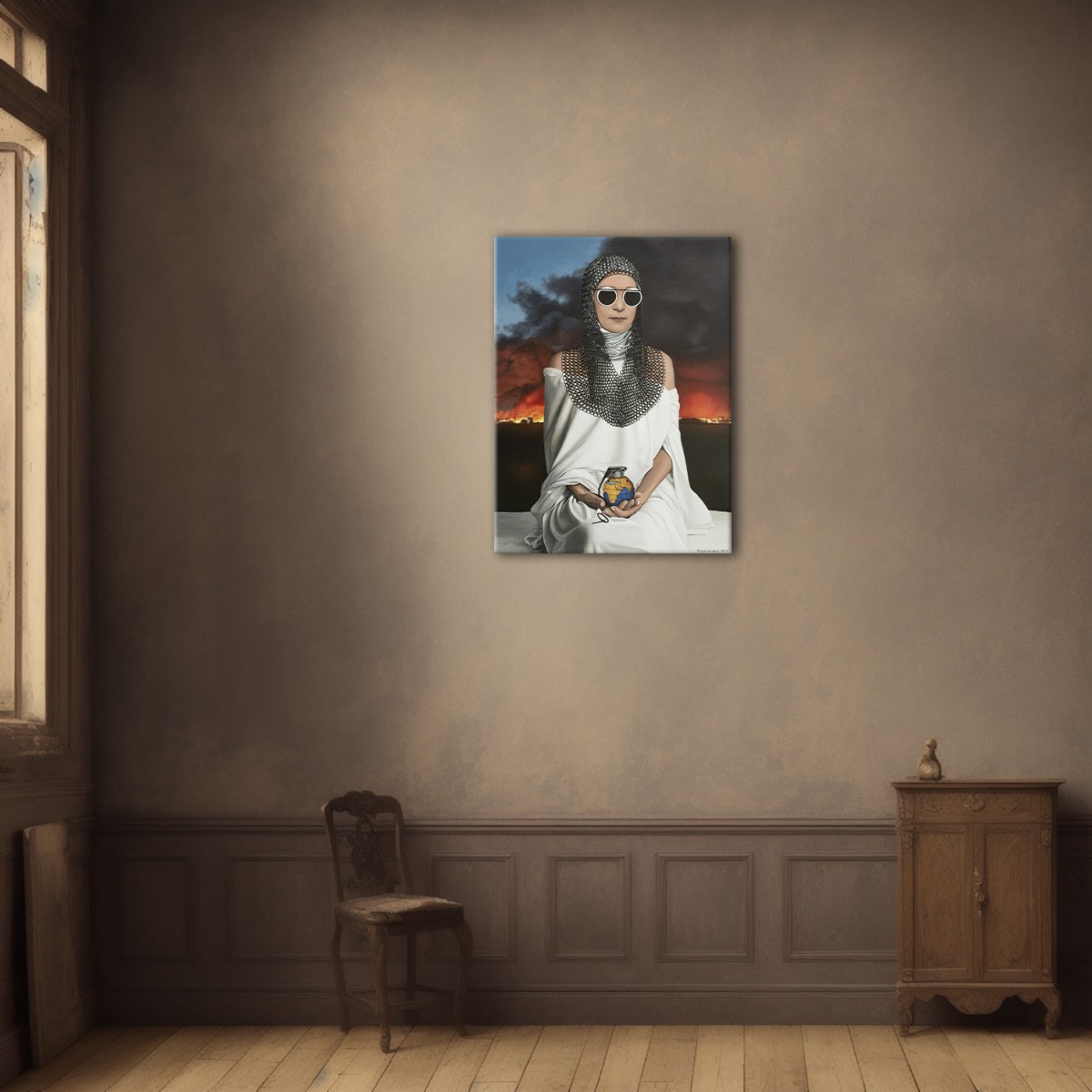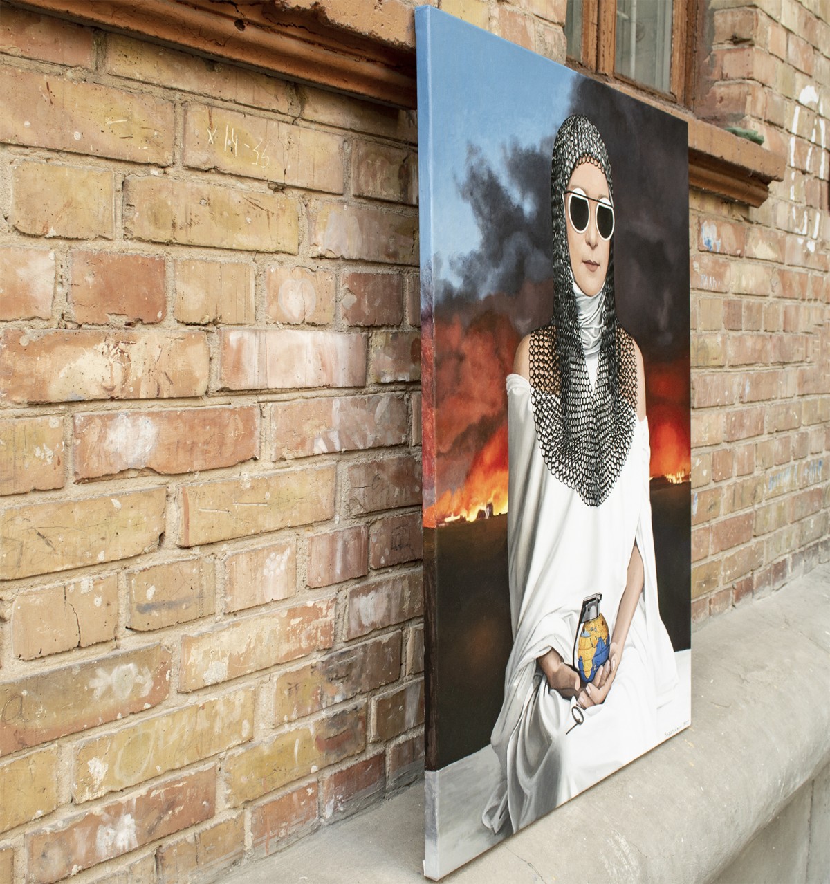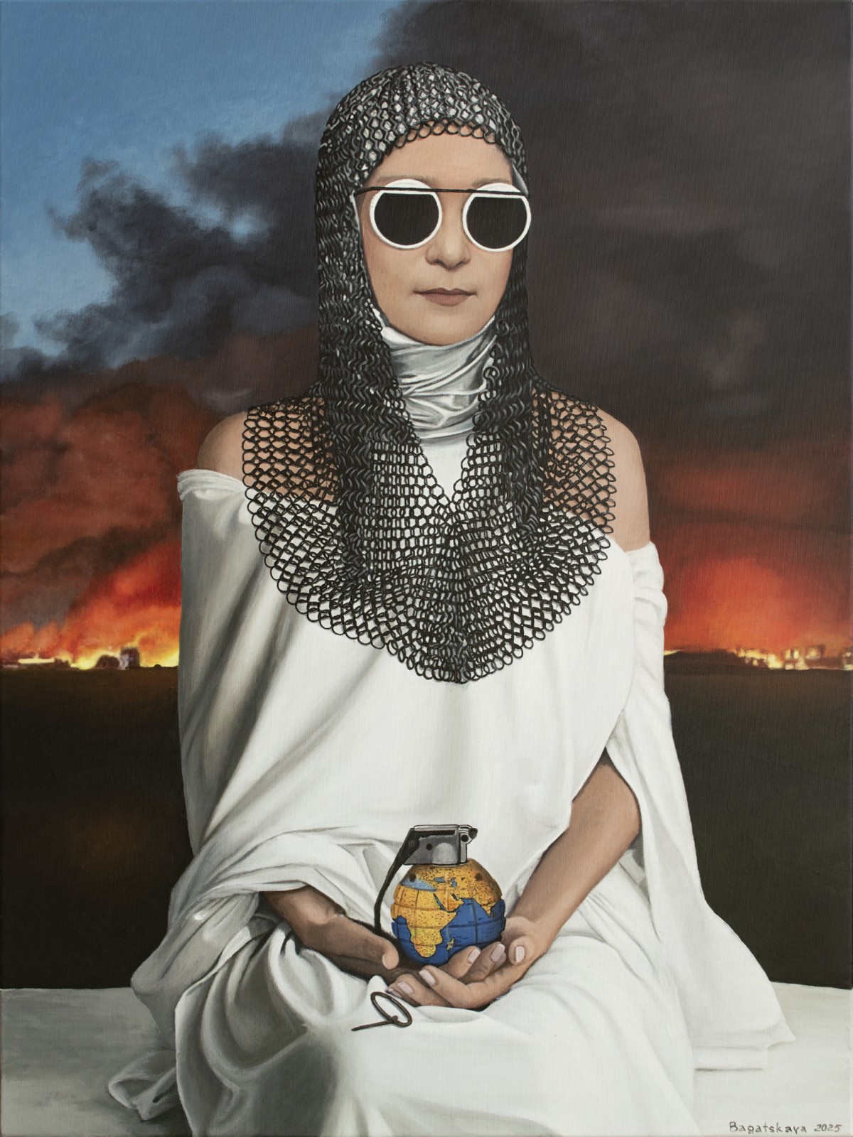 Any negotiations are meaningless; the aggressor can only be stopped and erased. Otherwise, it will advance further, consuming everything—like a single rotten fruit that spoils the entire crate. The pin has already been pulled, yet Ukraine still holds the grenade.A striking allegory of fragility and power, this painting depicts a woman in white robes and chainmail, holding a grenade shaped like our planet. Her mirrored sunglasses conceal emotion, leaving her role ambiguous—protector or catalyst. The burning horizon intensifies the urgency, while the serenity of her pose evokes timeless strength.