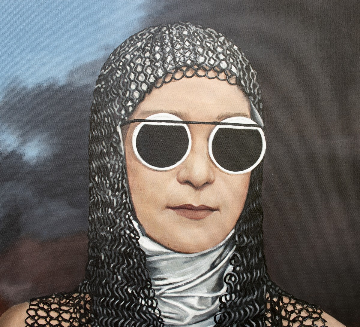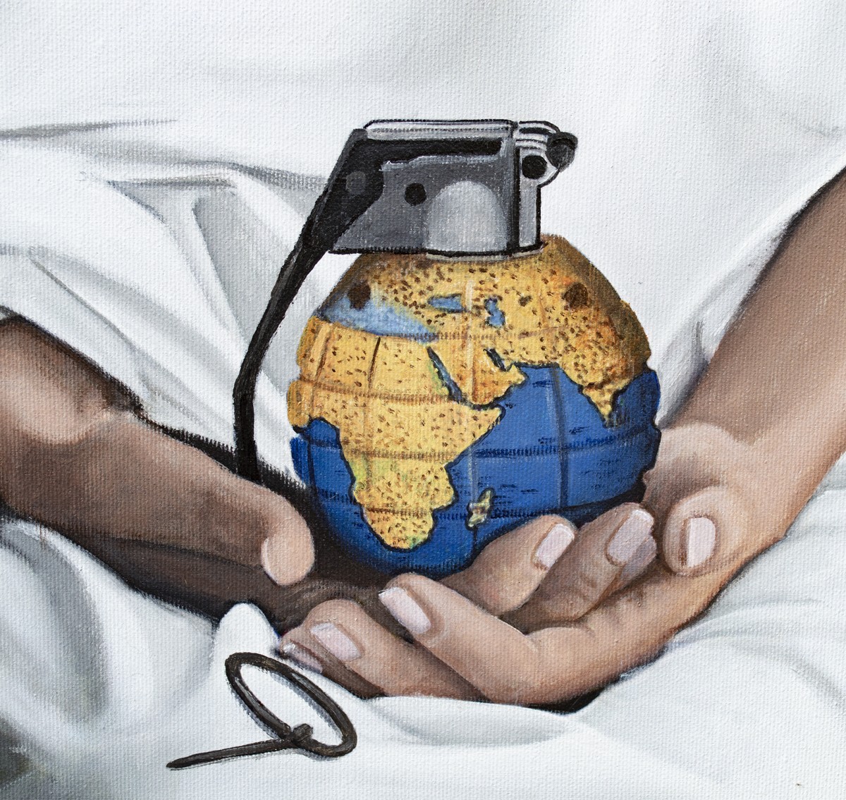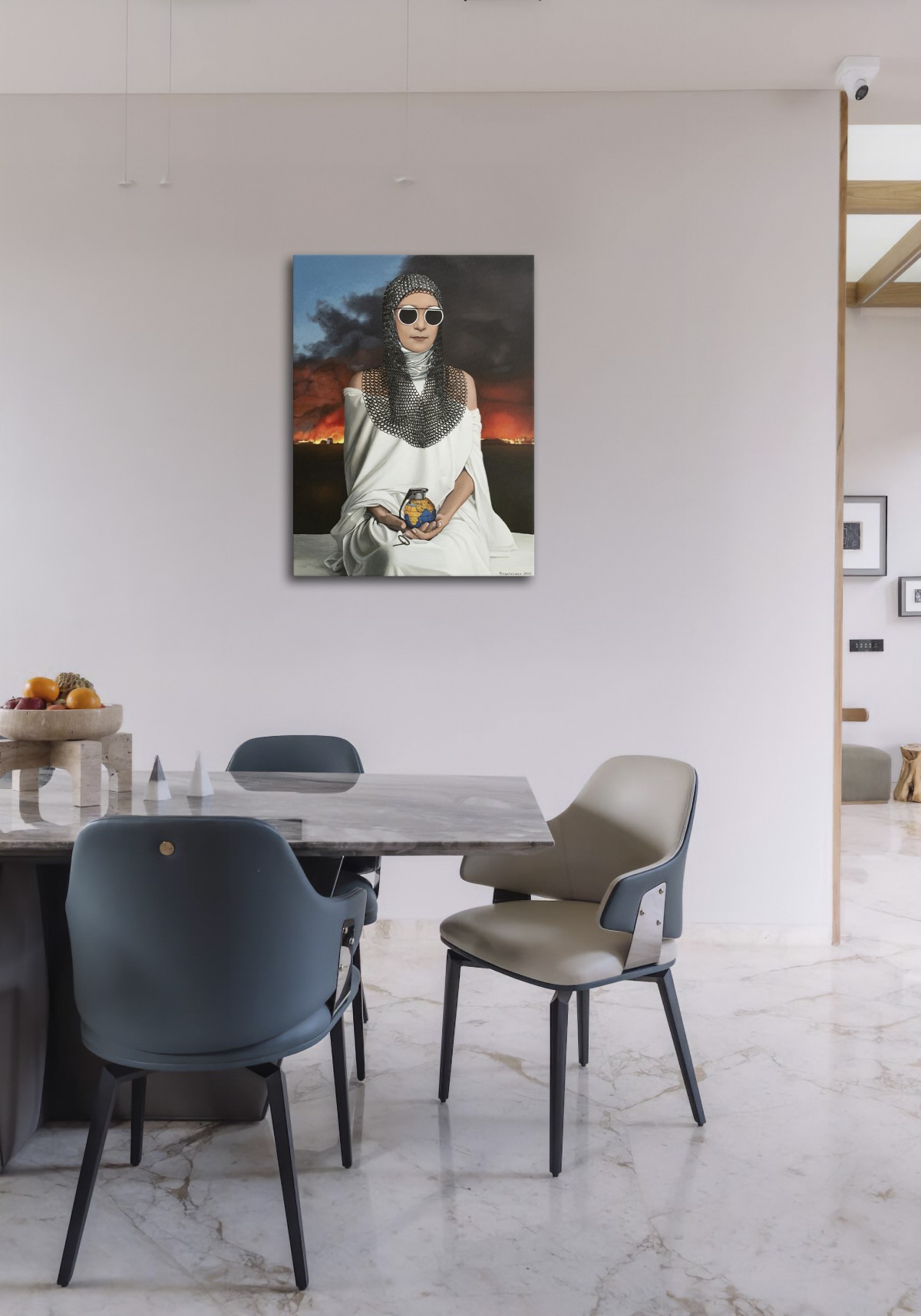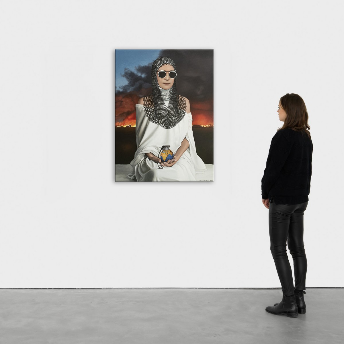 Any negotiations are meaningless; the aggressor can only be stopped and erased. Otherwise, it will advance further, consuming everything—like a single rotten fruit that spoils the entire crate. The pin has already been pulled, yet Ukraine still holds the grenade.A striking allegory of fragility and power, this painting depicts a woman in white robes and chainmail, holding a grenade shaped like our planet. Her mirrored sunglasses conceal emotion, leaving her role ambiguous—protector or catalyst. The burning horizon intensifies the urgency, while the serenity of her pose evokes timeless strength.