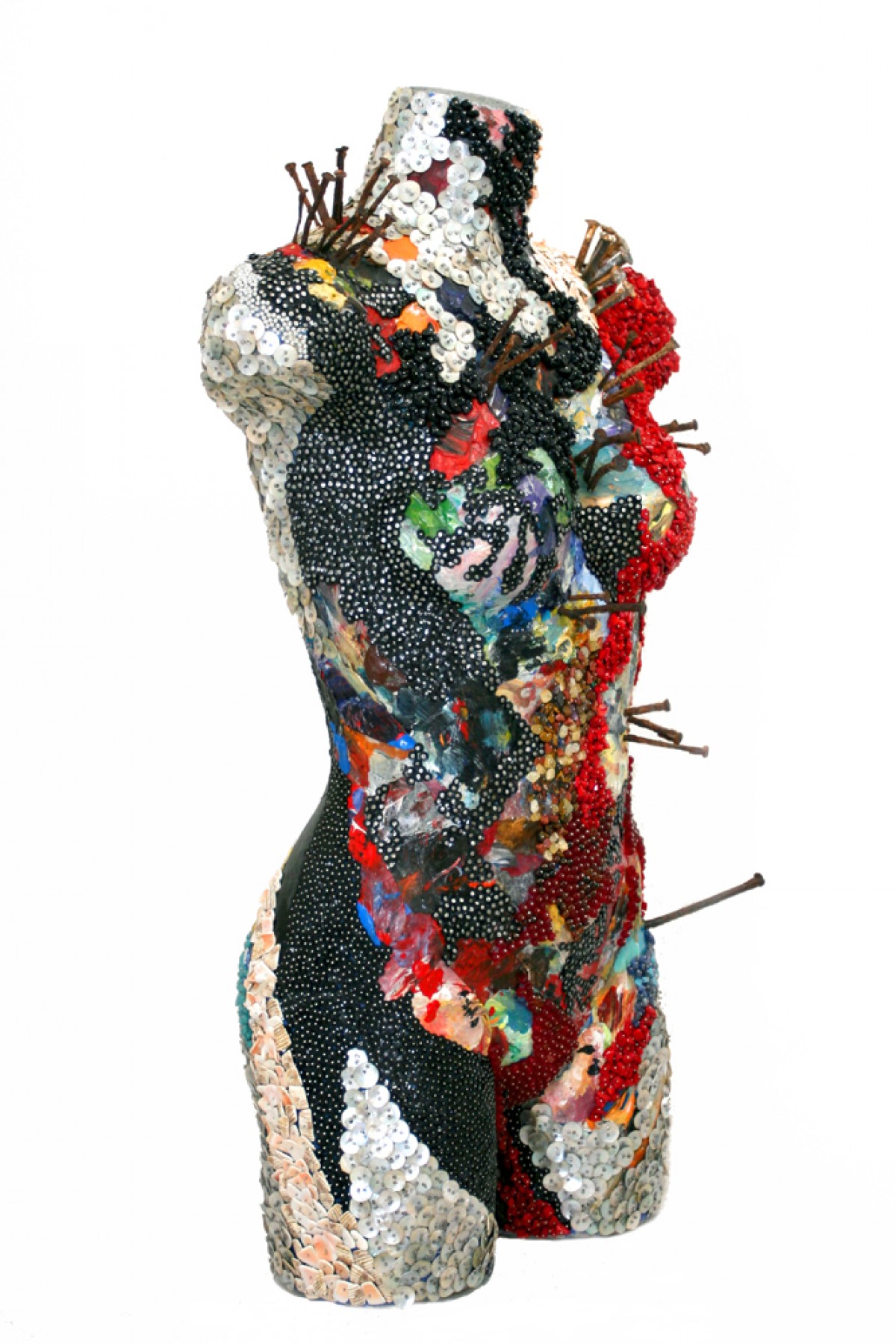 bust painted and covered with beads, nailed strass, coral, old nails.... Depicting San Sebastian's martyr.